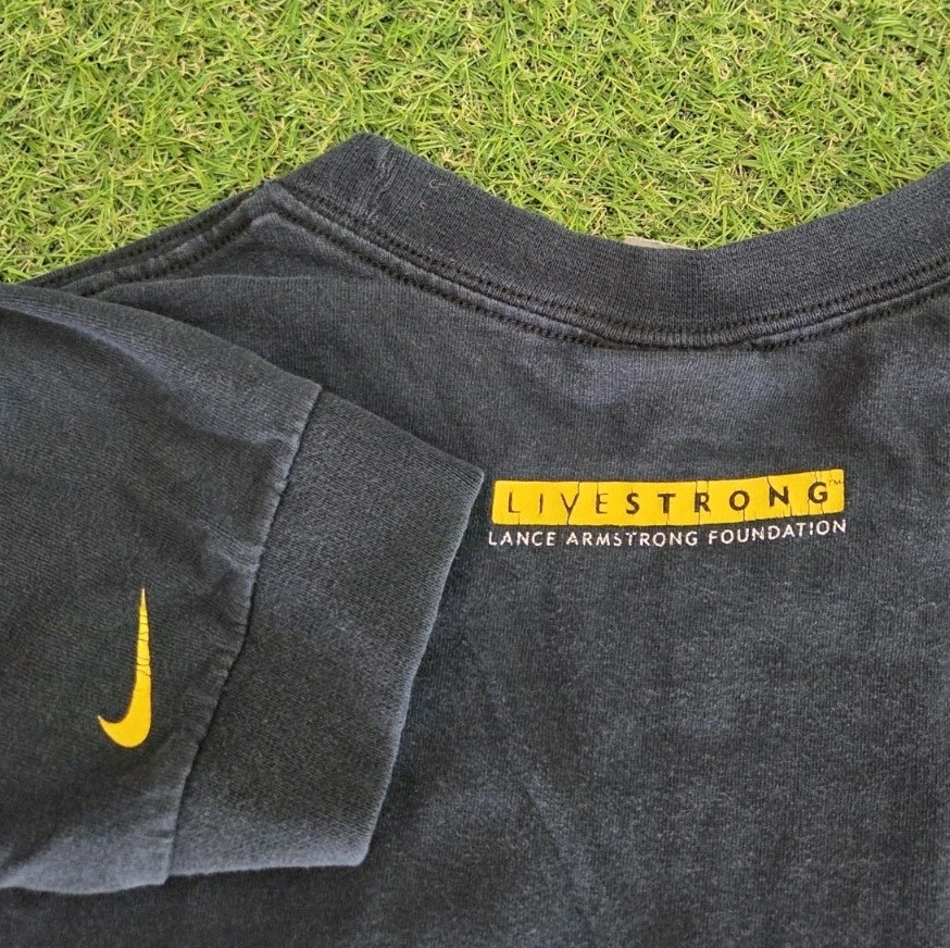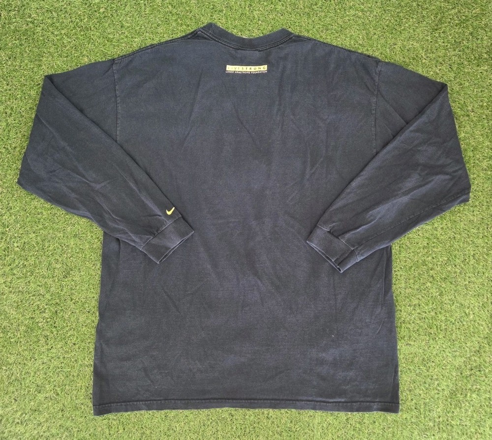 This Vintage Nike Team Lance Armstrong Live Strong Long Sleeve Black T Shirt in size XL is a classic piece with a solid black color and features the iconic Nike logo. Made of cotton and suitable for machine wash care, this 2000s era shirt has a crew neck and short sleeves. The shirt is perfect for fans of 90s sports theme and would make a great addition to any man's wardrobe.