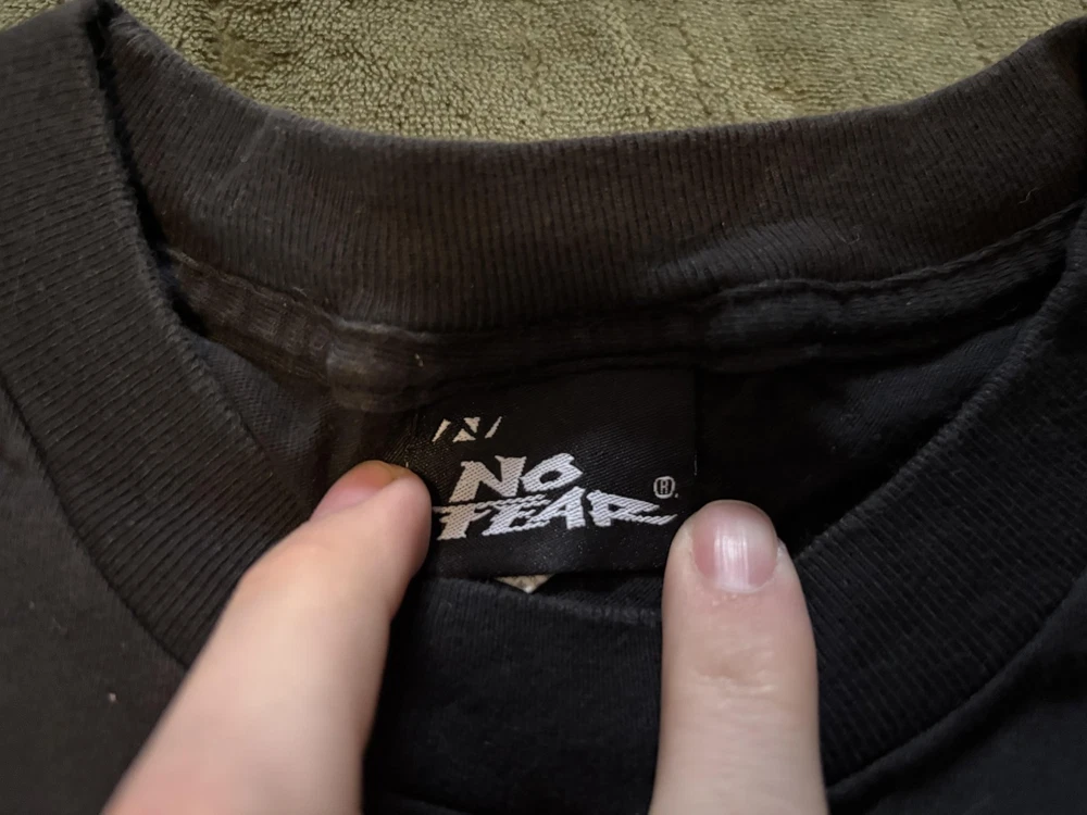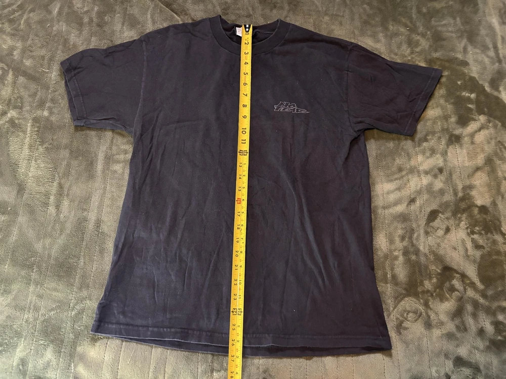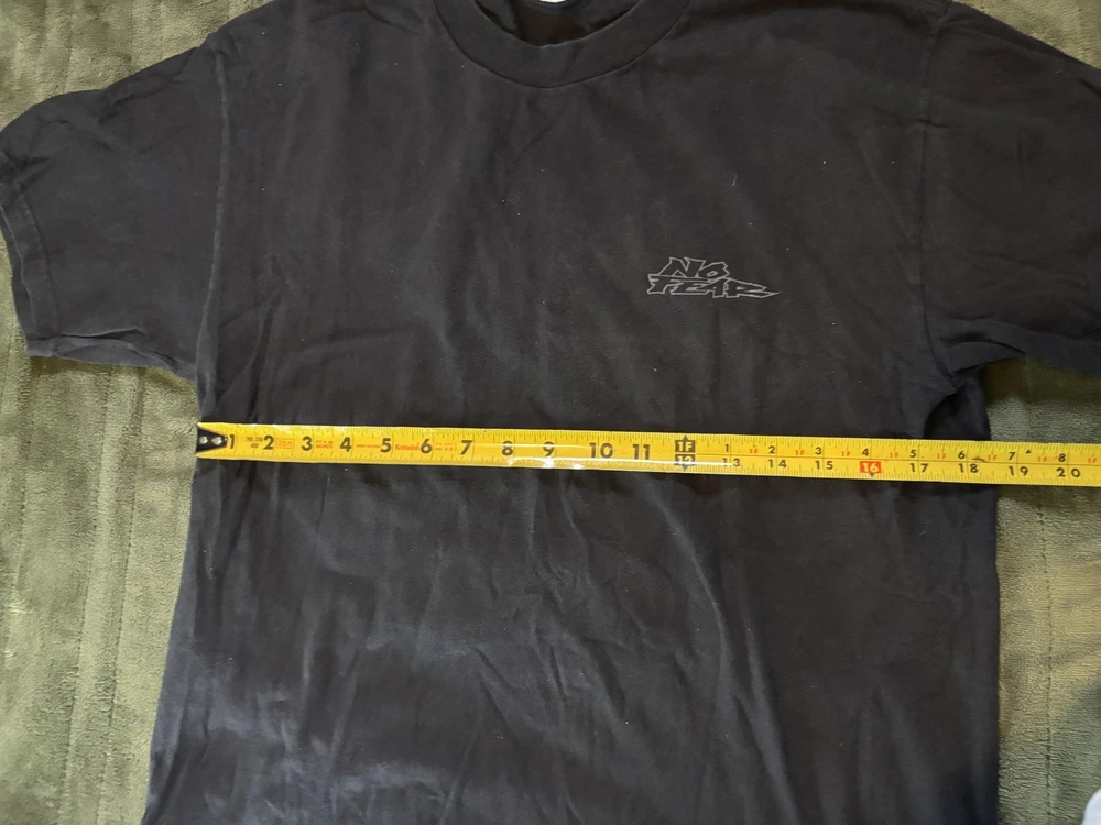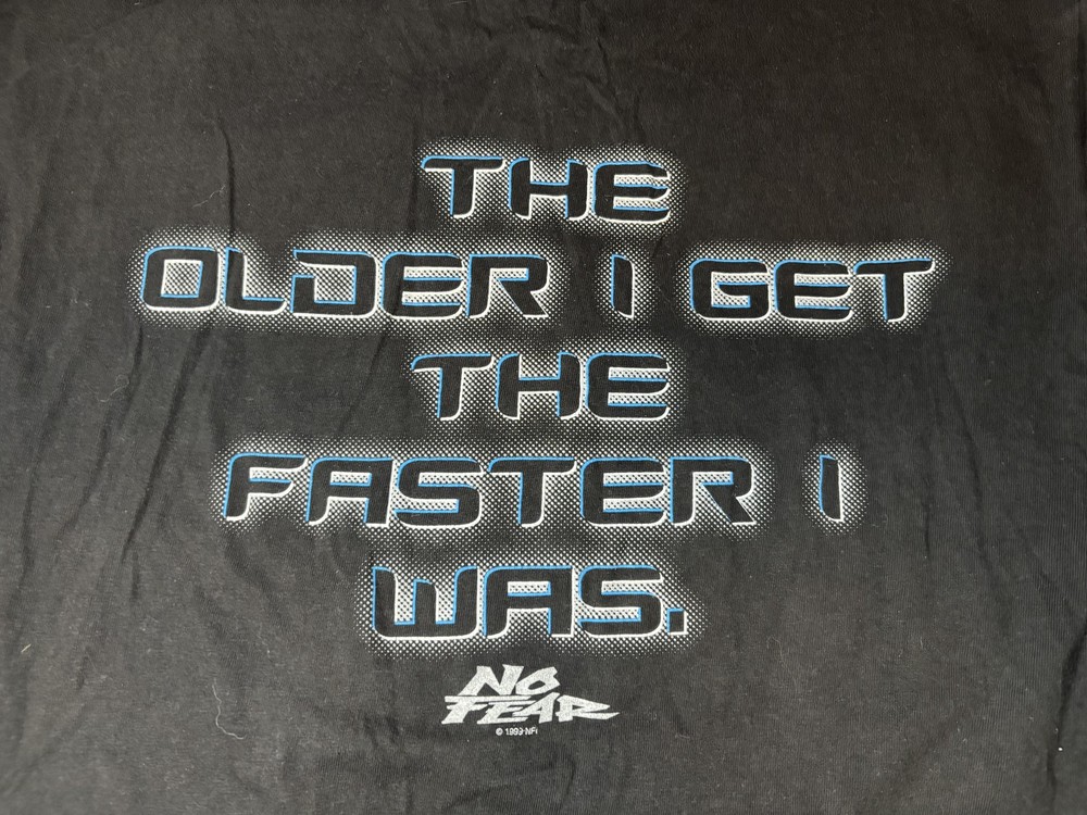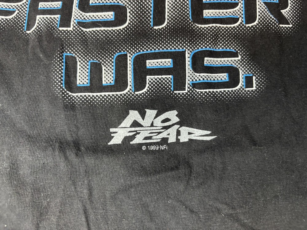 Brand: No Fear Style: Mens short sleeve graphic T-shirt with small front logo and large back slogan. Size: Mens Medium (per interior tag listing Adult M 38-40). Color: Black fabric with blue and white printed graphics. Material: Preshrunk 100% cotton jersey (per interior label). Country of origin: Assembled in Mexico using U.S.A.-made components (per interior label). Details: Regular fit crew neck T-shirt designed for casual everyday wear and nostalgic 1990s streetwear style. Additional features: Ribbed crew neckline, short sleeves, and straight hem. Logo details: Small No Fear logo printed at the left chest and larger No Fear logo incorporated into the back graphic. Graphic text: Back print reads "THE OLDER I GET THE FASTER I WAS." with No Fear logo and 1999 NFI below. Label text: Interior tags list No Fear branding, preshrunk 100% cotton fiber content, Adult M (38-40) sizing, assembled in Mexico from U.S.A.-made components, style code PL 9716, and machine wash warm care instructions. Season: Midweight cotton T-shirt suitable for summer wear or year-round layering. Keywords: vintage No Fear shirt mens medium black older I get faster I was 90s funny graphic tee