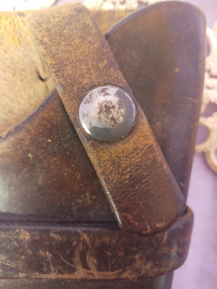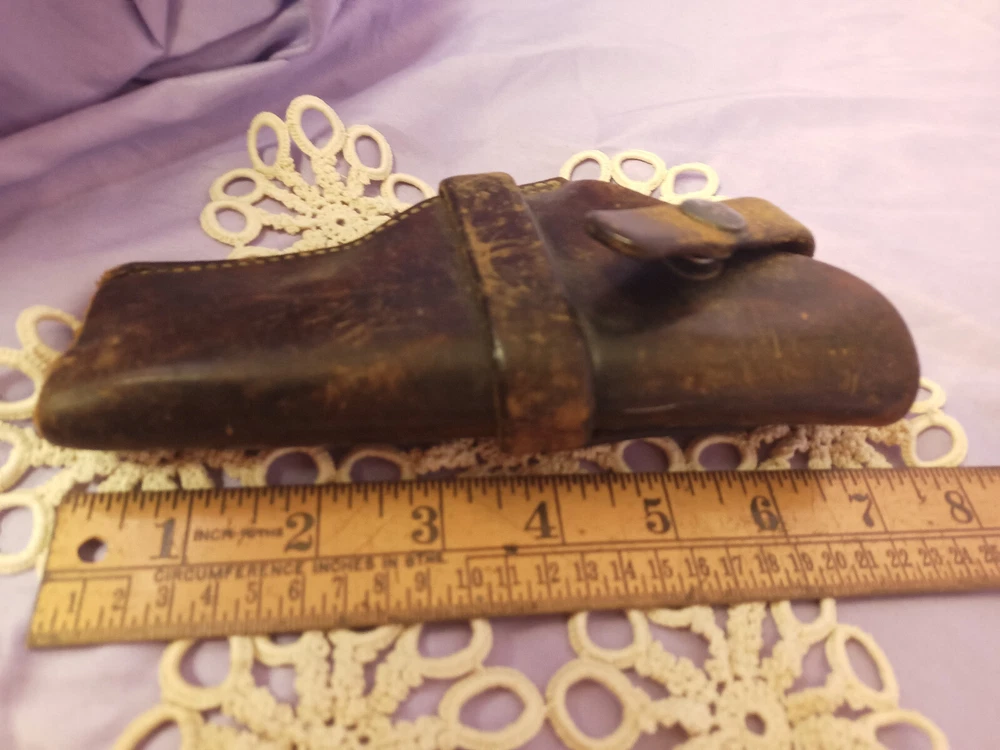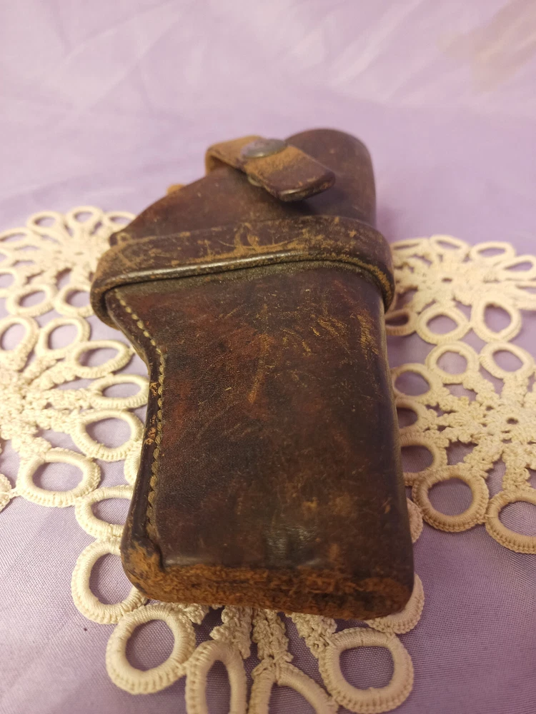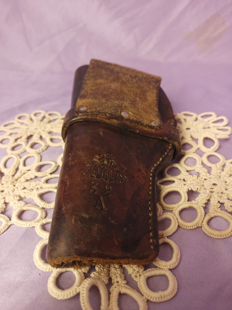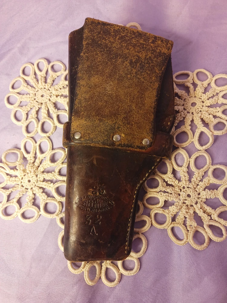This is a vintage holster, made by George Lawrence. The dark brown leather steerhide material gives it a classic look. This holster is perfect for anyone looking for a high-quality, reliable option for their gun. Whether you're a collector or an active shooter, this holster is sure to impress. Condition is worn but solid.