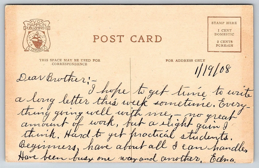 Era: Divided Back (1907-1915) Country/Region of Manufacture: United States Region: Minnesota Signed: Yes Seller Notes: “Good Vintage Condition. See Pictures And Description Closely For Details.” Type: Original Genuine Antique Vintage Postcard Brand/Publisher: Hammon gtin13: DOES NOT APPLY City: Minneapolis Theme: Architecture, Cities & Towns, Community Life, Domestic & Family Life, Famous Places, Fashion, Historical Figures, Landscapes, Nautical, People, Roadside America, Seasons, Social History, Postcard, Antique, Vintage, Ephemera, Collectible, Memorabilia, Old, Retro, History, Card, Mail, Paper Color: Multicolor Subject: Cities & Towns Finish: Matte Continent: North America Featured Person: People Postage Condition: Unposted Features: Divided Back, Original Genuine Antique Vintage Postcard Unit of Sale: Single Unit Posted: No Original/Licensed Reprint: Original Stamp: No Size: Standard (5.5 x 3.5 in) Time Period Manufactured: 1900-1919 Vintage: Yes Antique: Yes Signed By: Sender UPC: DOES NOT APPLY Number of Items in Set: 1 Year Manufactured: 1908 Material: Paper Orientation: Horizontal Country: United States Location: Minneapolis, Minnesota USA