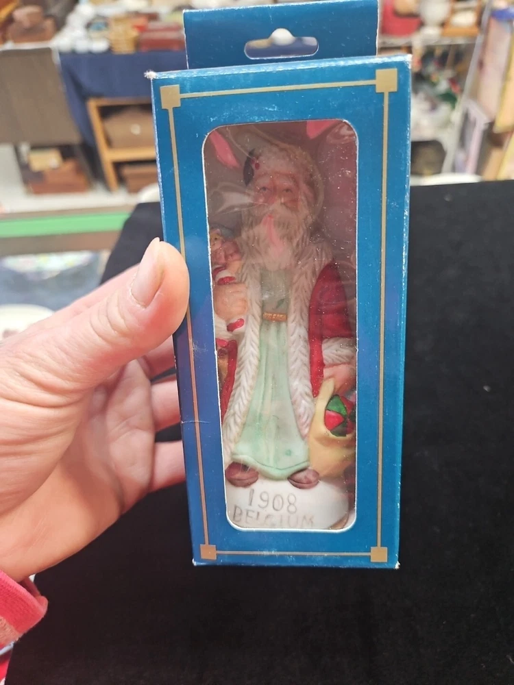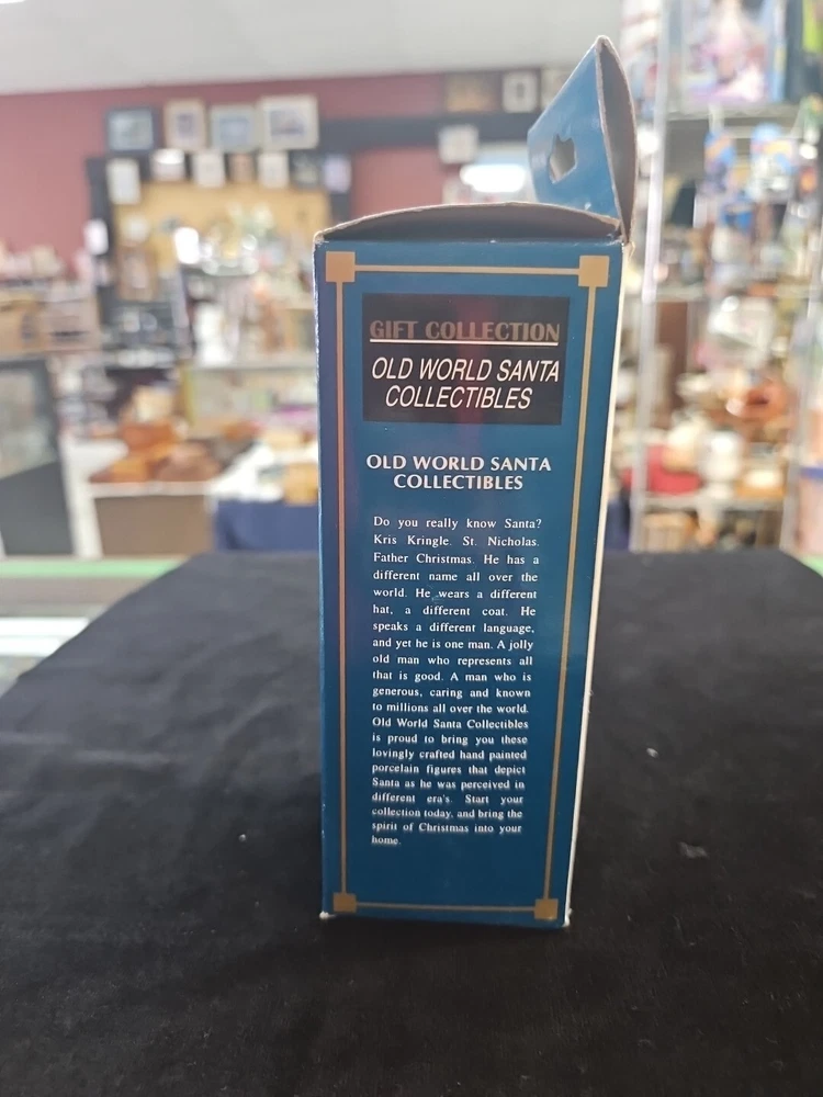 This is a vintage Santa figurine made of porcelain. It features a multicolor design and is part of a limited edition collection. The figurine is in its original box and is a licensed reproduction from the late 20th century. It measures 5 inches in height, 5 inches in length, and 2 inches in width. The Santa figurine is a great addition to any Christmas collection and is perfect for adults.