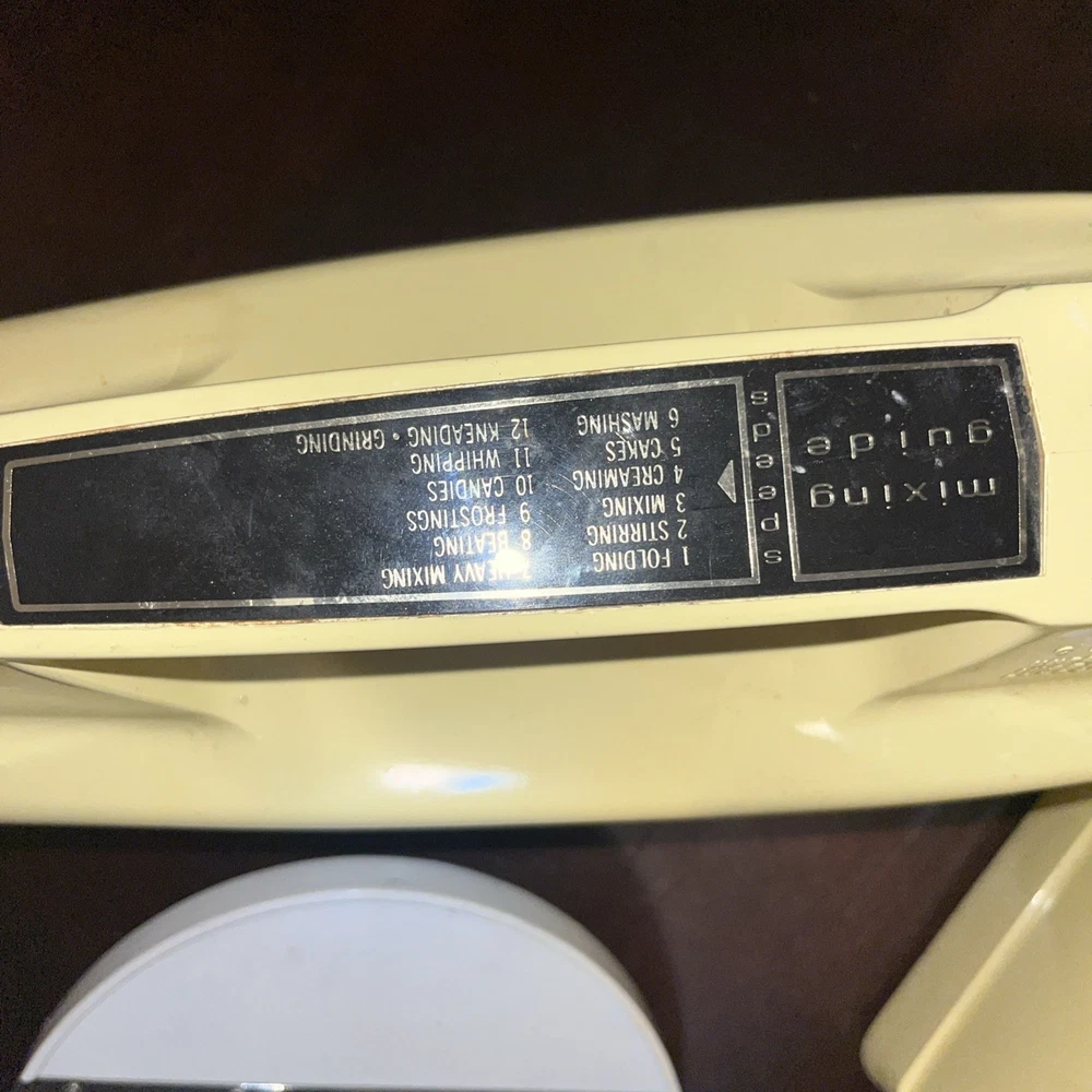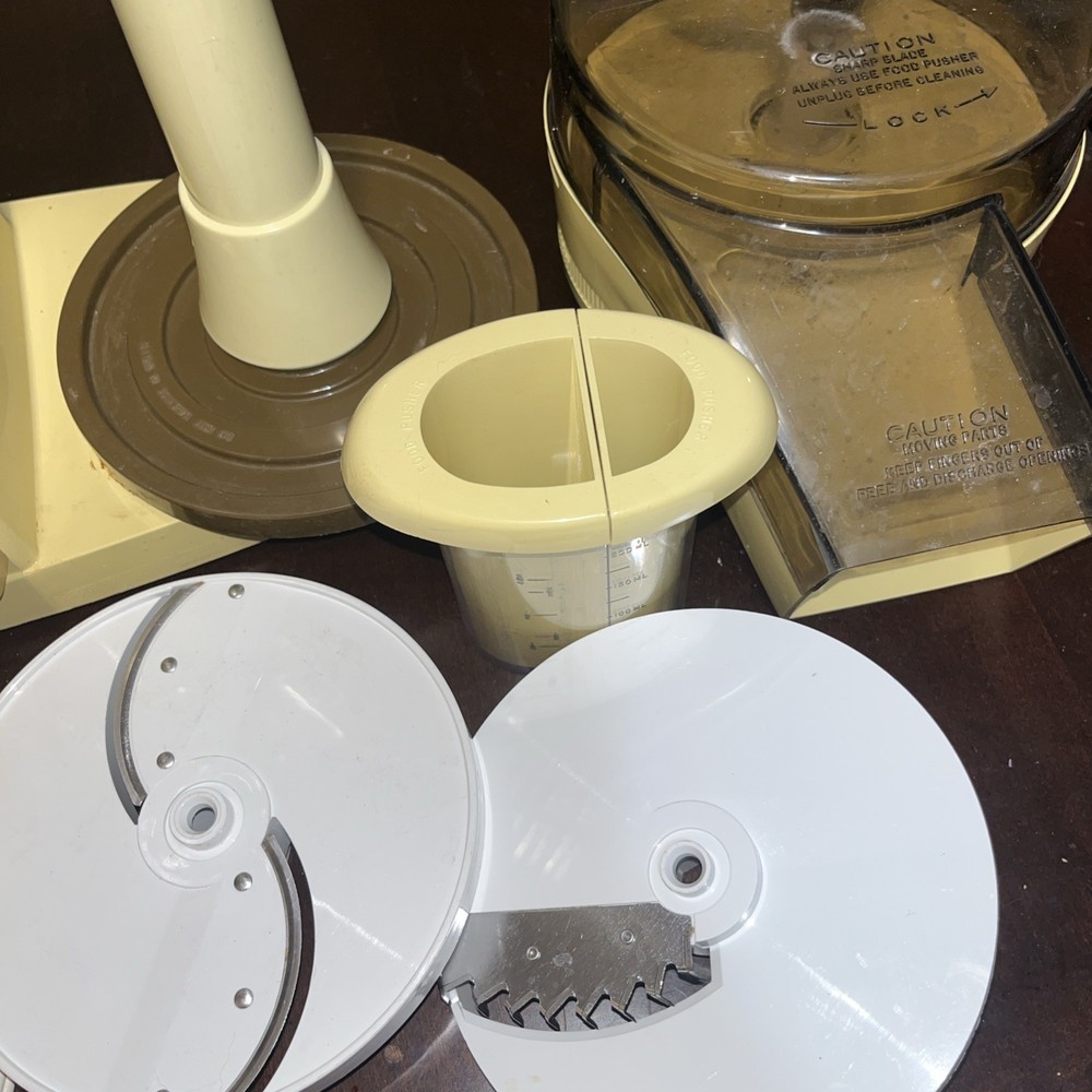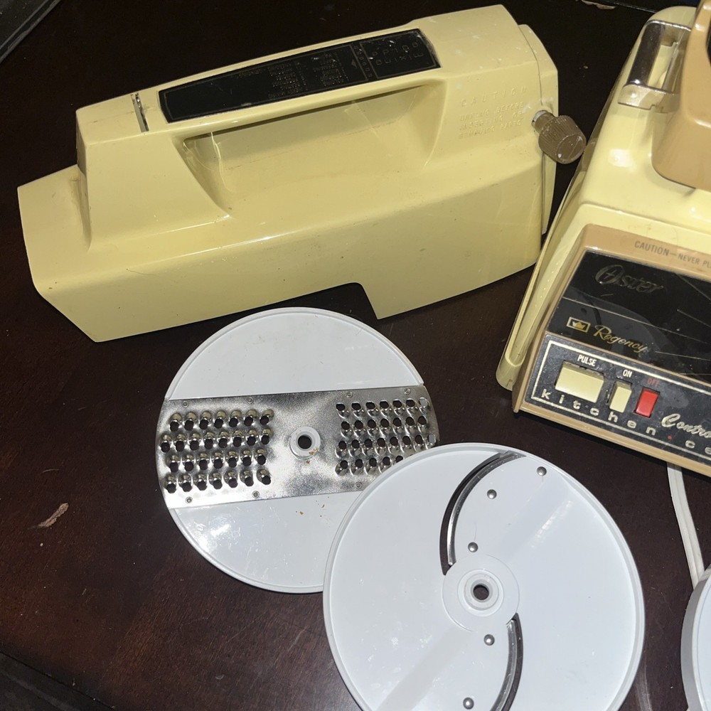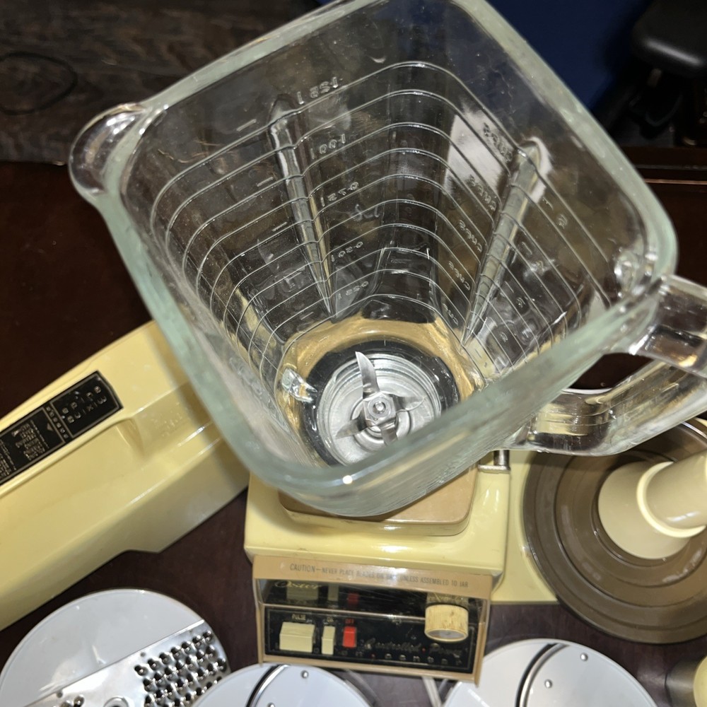 The Vintage Oster Kitchen Center is a versatile food processor with a wide range of capabilities including blending, slicing, beating, grating, and salad functions. This electric appliance, with a beige color and 10 different speeds, was manufactured in the United States by the trusted brand Oster. With 13 included components such as blades, slicers, a measuring cup, mixer,m, chopper, base, and grinder, this kitchen center offers convenience and efficiency for all your kitchen needs. The 450W power source and variable speed control make it a reliable choice for home cooking.