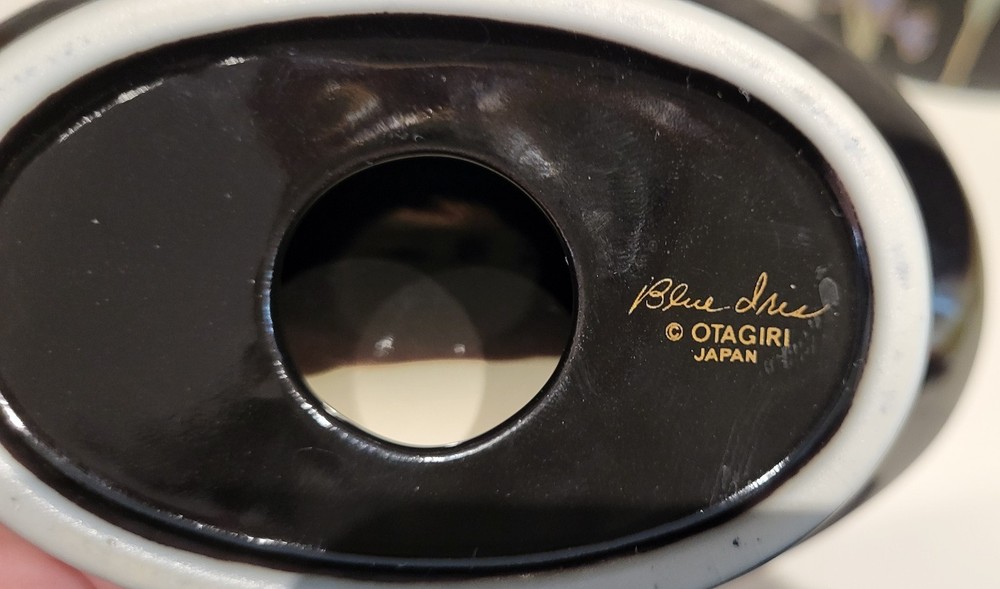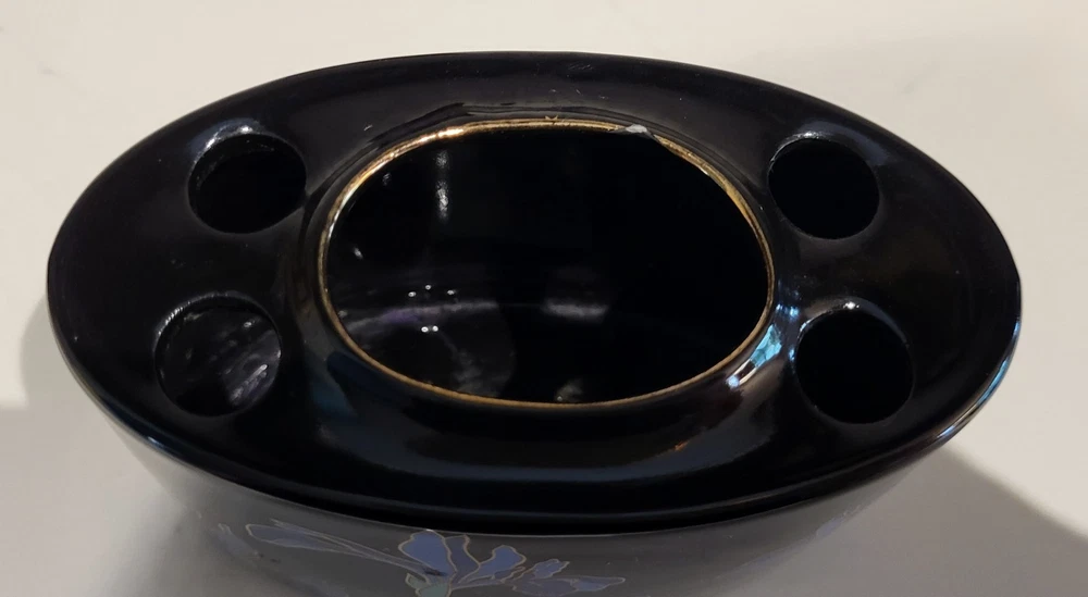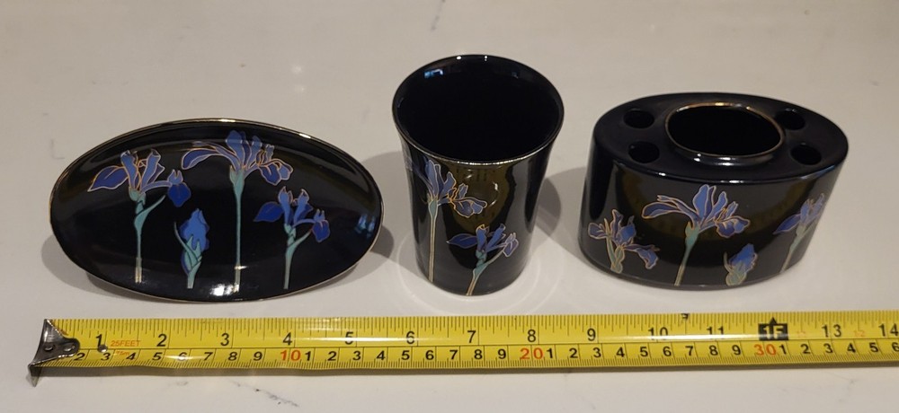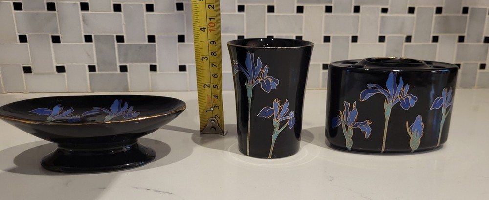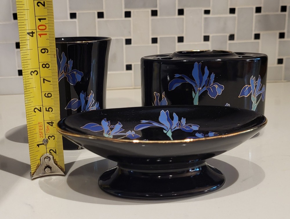 This is a vintage Otagiri bathroom accessory set made in Japan. The set includes a tumbler, toothbrush holder, and soap dish, all in black with a blue Iris pattern. The pieces are made of porcelain and are in great shape. The only flaw is a chip on the inside rim of the toothbrush holder. No other issues. See pics for full condition details including measurements and let me know if you have any questions. Thank you!