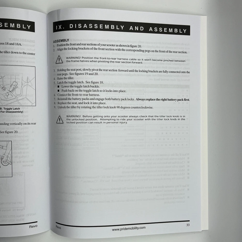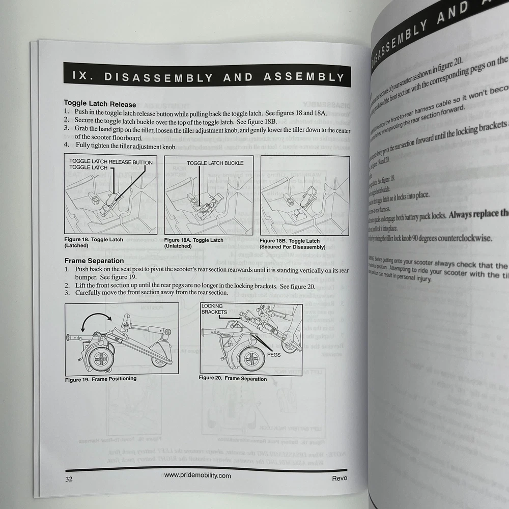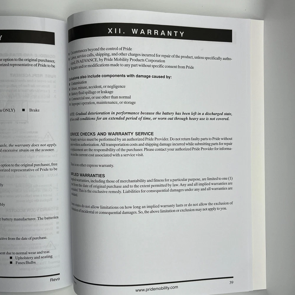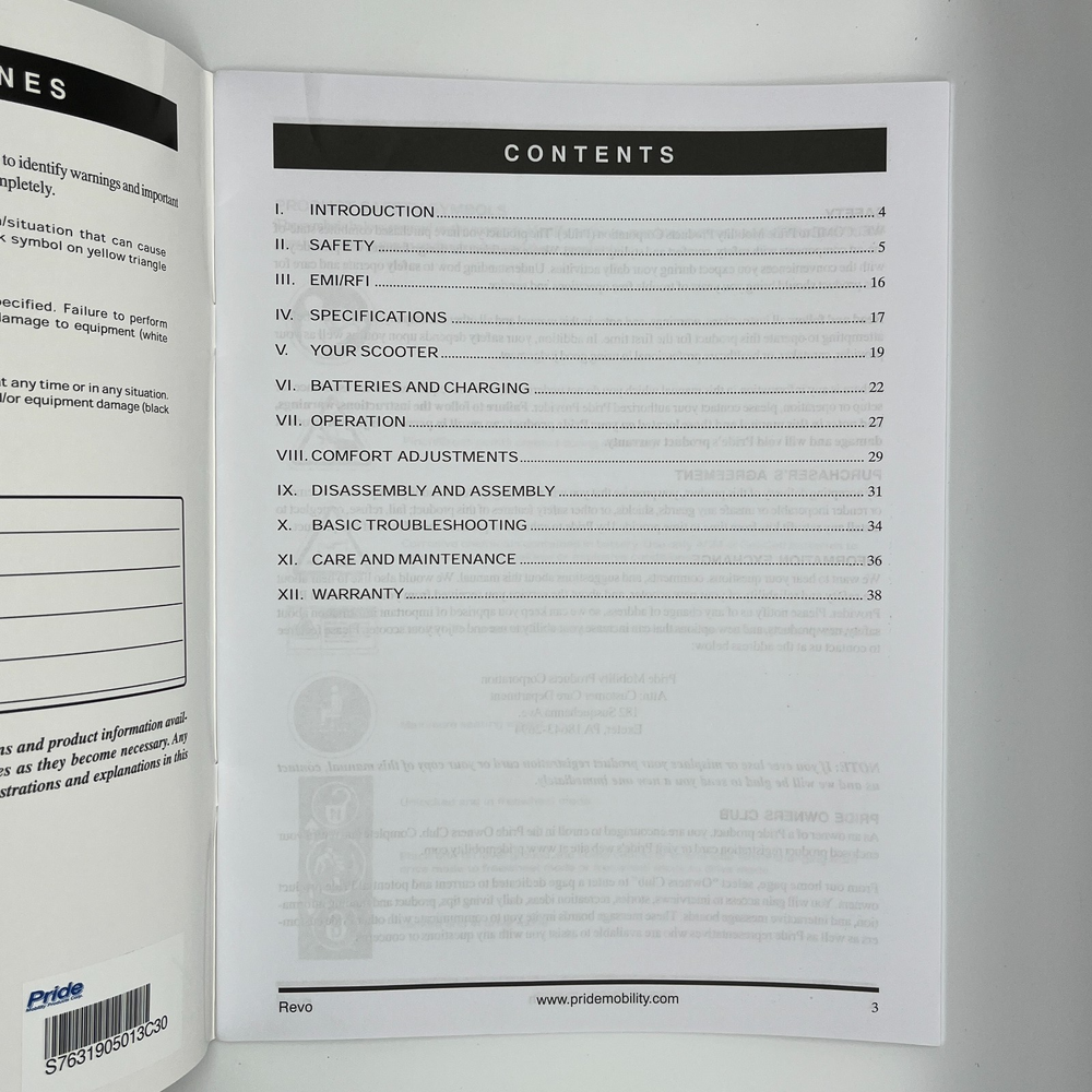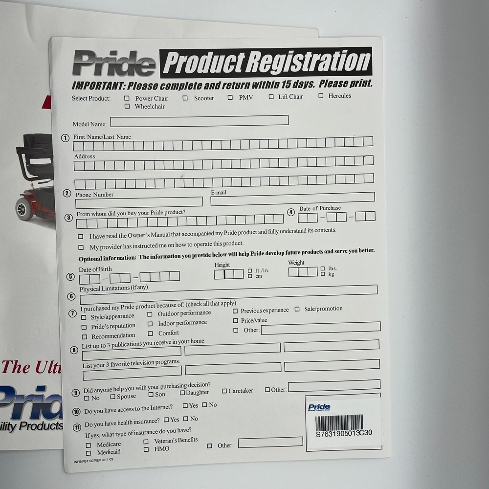 Vintage Owner's Manual REVO Pride 3-wheel Mobility Scooter w/ 3 Cotterless pins c2005 This is an original (not photocopied) owner's manual for Pride Mobility Revo 3-wheeled scooter PM2A3-S11G with 3 cotterless pins and allen wrench. Size: approximately 11 x 8-1/2 inches 39 pages. Includes 3 cotterless pins and an allen wrench This item has very minimal expected signs of aging like yellowing, stains, creases, and tears. Zoom in on the photos for details and to assess condition. Items will ship in a semi-rigid envelope. I hope this is something you've been looking for. Inventory Note: OM1-N
