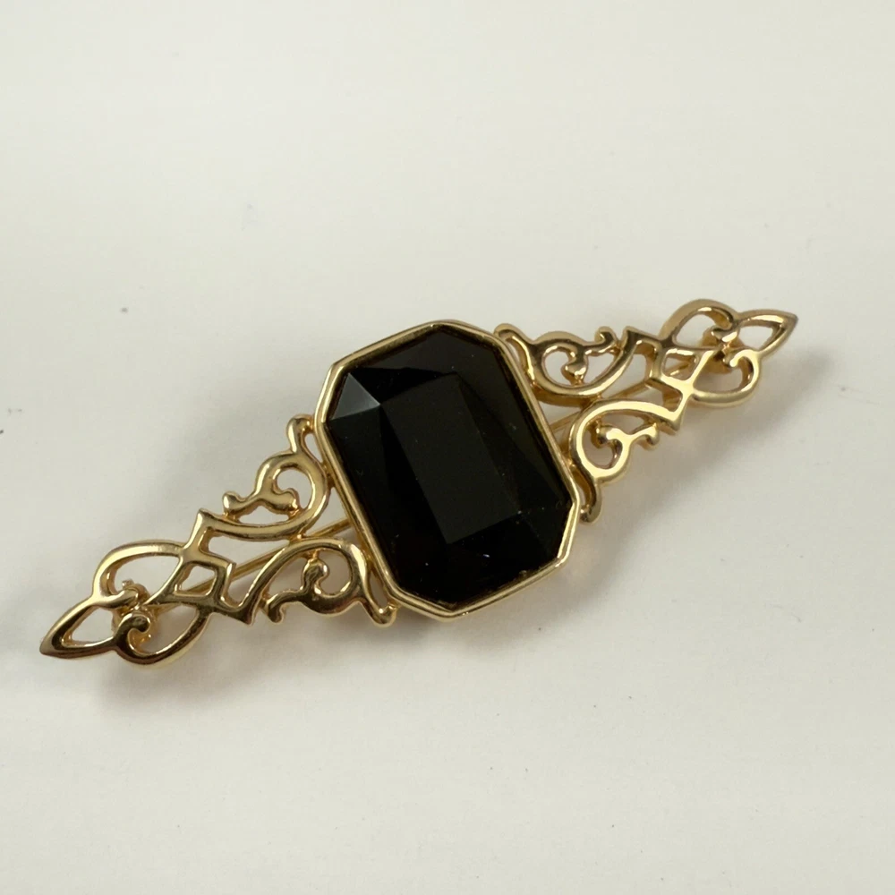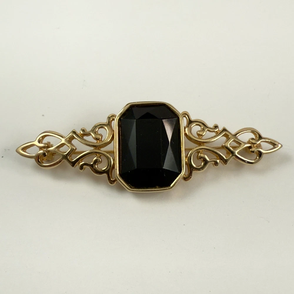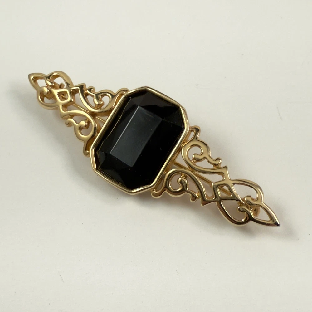 Vintage PARK LANE Black Faux Onyx Gold Tone Brooch Estate Pin. Pre-Owned Estate Jewelry in Very Good Condition. Ready to wear, give as gift or add to a collection. Our Vintage items are mostly from estate sales and vary in age from 100+ years old to more modern pieces. Please use your judgement. Items are photographed on a measuring matte with one-inch squares to give you an idea of size. Any photography props / holders you see are not included.