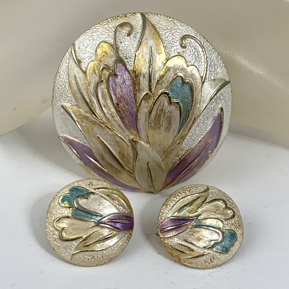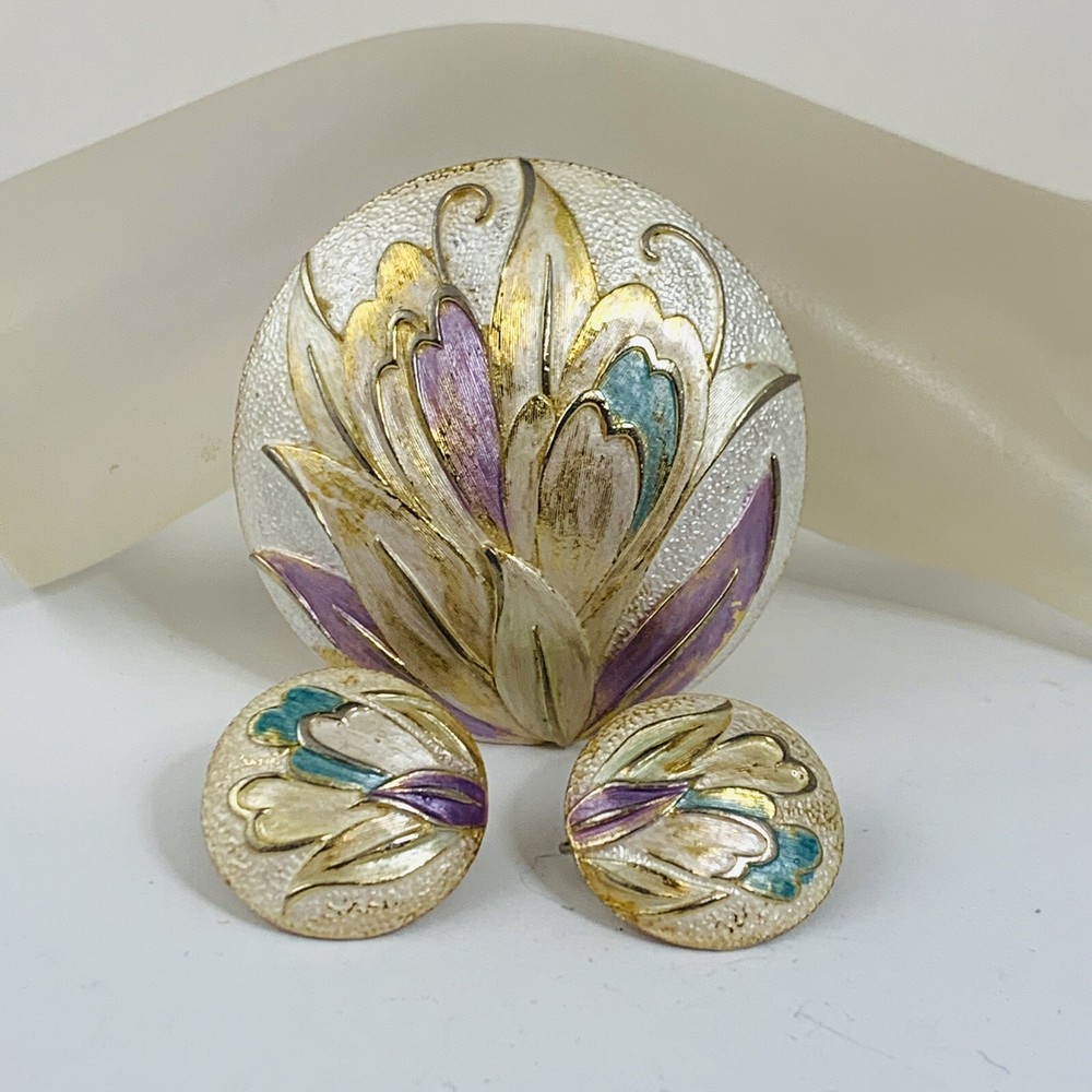 Item : Vintage PARK LANE Unsigned Pastel Enameled Round Brooch Interchangeable as a Pendant and Clip on Earrings Set. Age : Our Vintage items are mostly from estate sales and vary in age from 100+ years old to more modern pieces. Please use your judgement. Size : Items are photographed on measuring matte with one-inch squares to give you an idea of size.