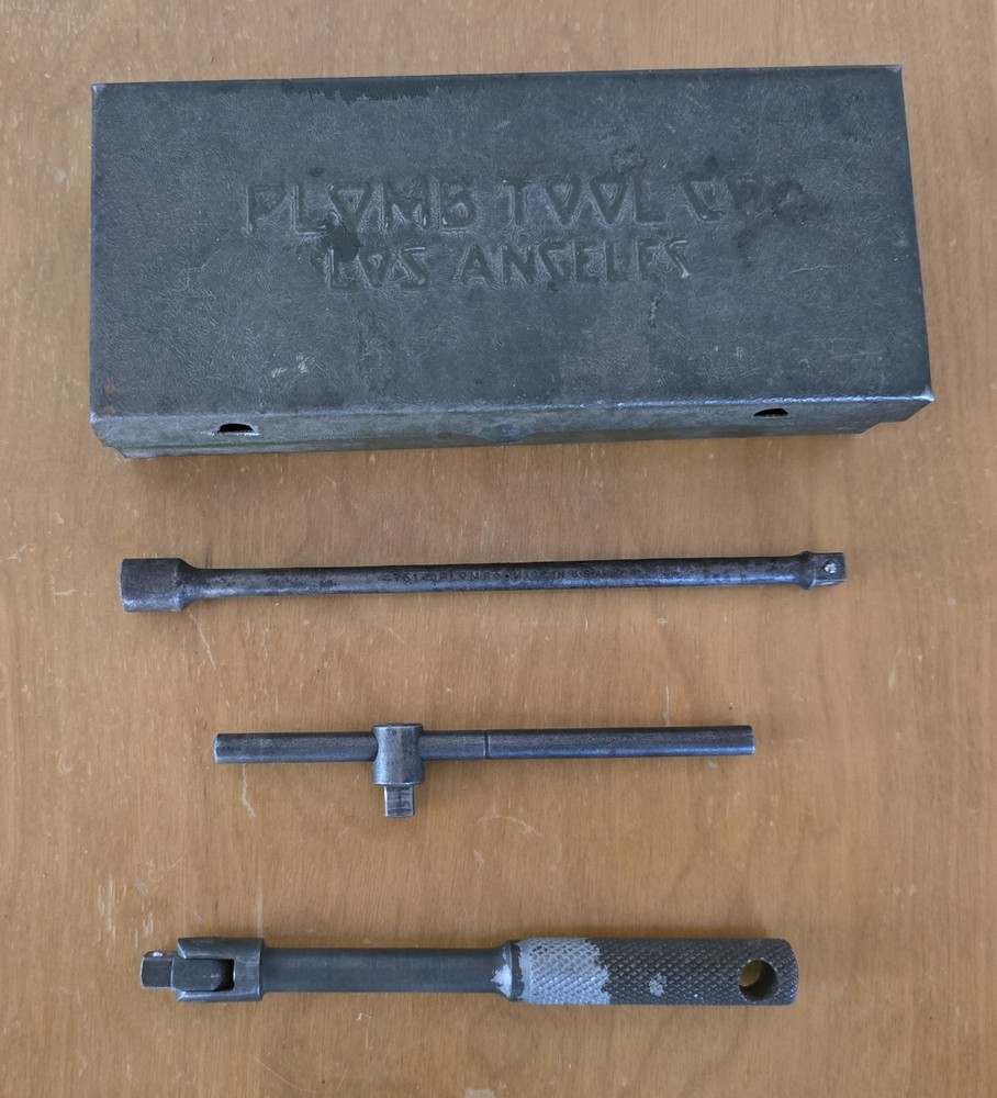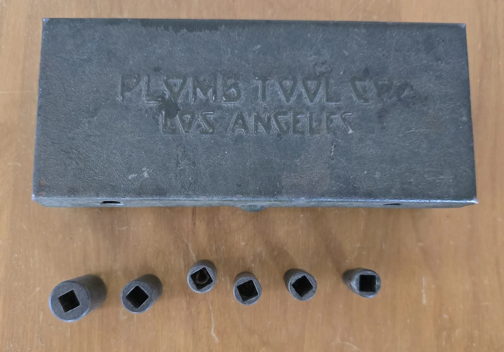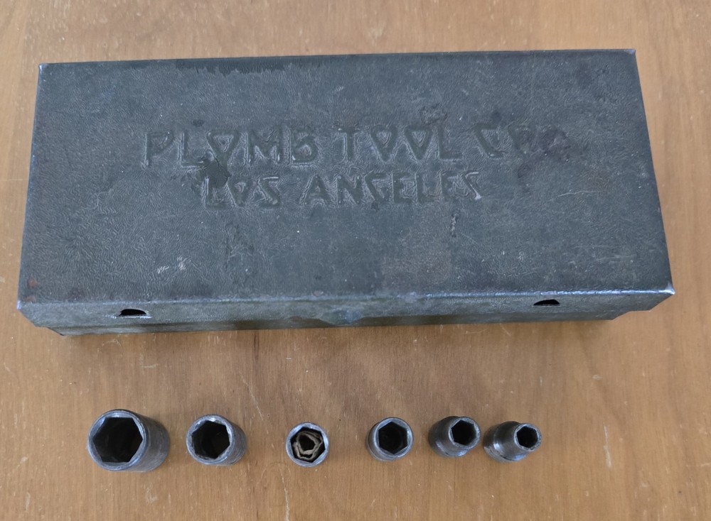 The box is 6.5in long and 3 inches wide and in great condition for its age. It closes tight and I don't see any rust. Six Sockets, 6 inch extension, t- bar, and breaker bar.