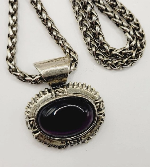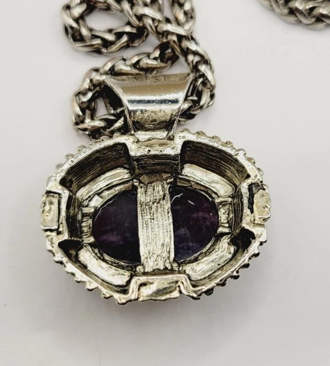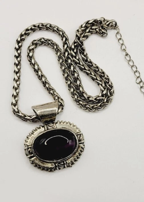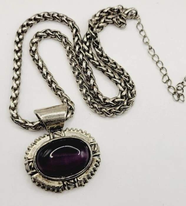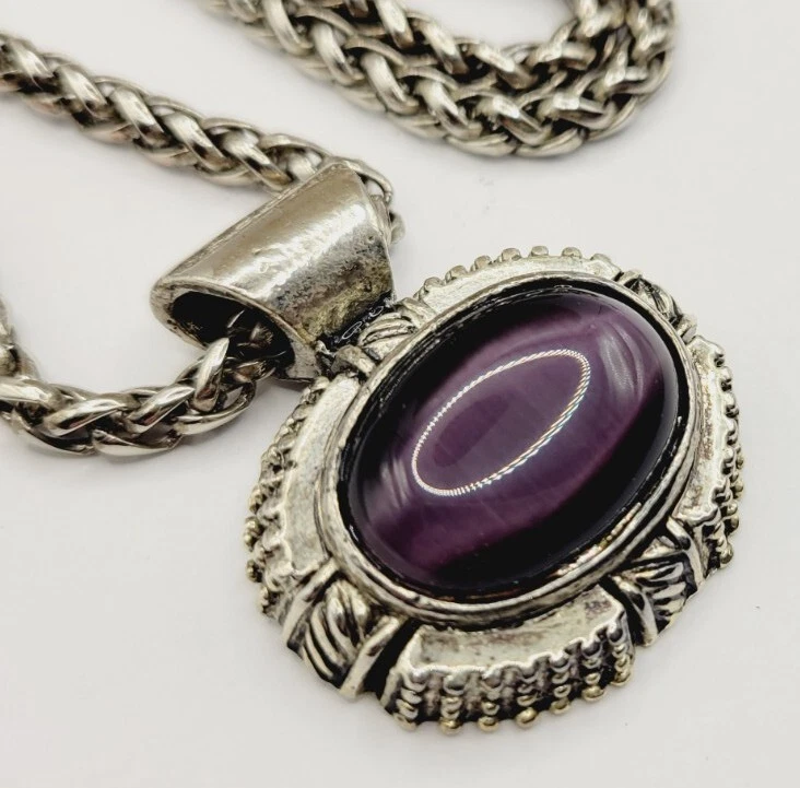 Vintage PURPLE CAT EYE Large Silver tone Sliding Pendant Necklace 21 in