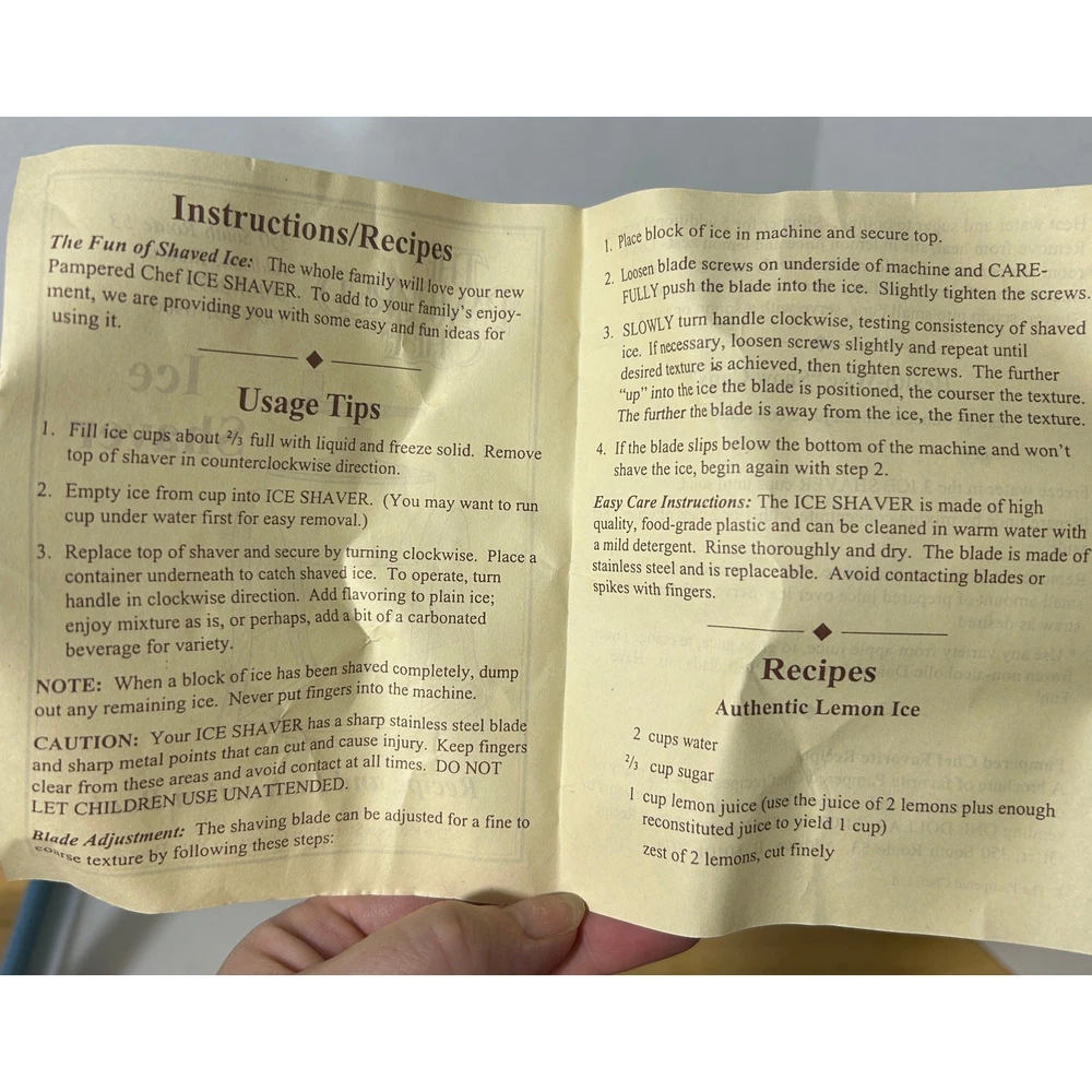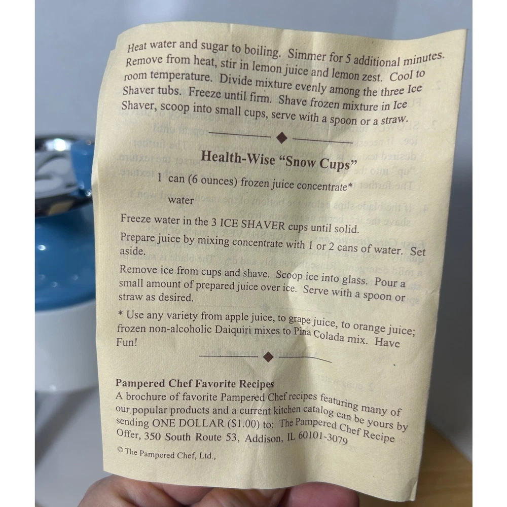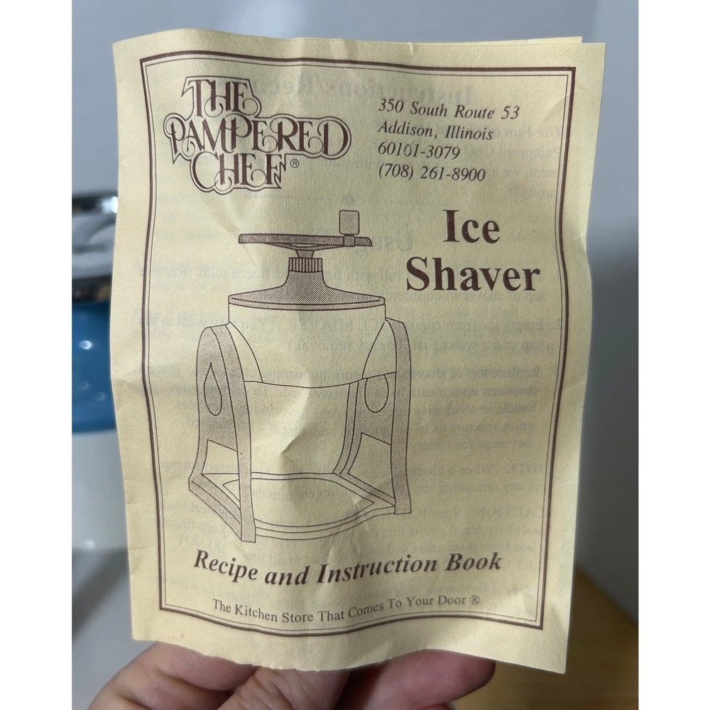This vintage Pampered Chef Ice Shaver is a unique, hand-cranked kitchen tool that produces fluffy shaved ice for your favorite frozen treats. Standing 12.5" tall and 8" wide, this ice shaver comes with all its original components: the base, handle, ice mold, collection bowl, and instruction manual. It’s in excellent, pre-loved condition, showing minimal wear and ready to use. The charming blue-and-white design adds a retro touch to your kitchen. This set includes 3 ice mold discs and a small square container, ensuring you’re fully equipped for summer fun. Whether you’re making snow cones, frozen cocktails, or slushies, this shaver will help you achieve smooth, finely shaved ice in no time. Please note, this item is pre-loved and may have minor imperfections not otherwise noted in the description.