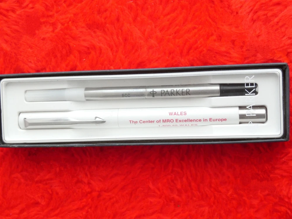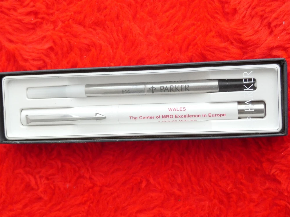 Vintage Parker Roller Ball Ink Pen In Original Box New in Original Box Old New Stock Brand: Parker Type: Roller Ball Pen Color ink: Black Color Of Pen: White with Silver Chrome Material: Plastic and Chrome Made in the USA Advertising Wales On the pen it says "The Center of MRO Excellence in Europe" Has the telephone number for Wales Works great Please see Photos for more description COMES FROM A SMOKE FREE HOME Any questions please feel free to ask me Thanks for looking! Come and see my other items Powered by SixBit's eCommerce Solution