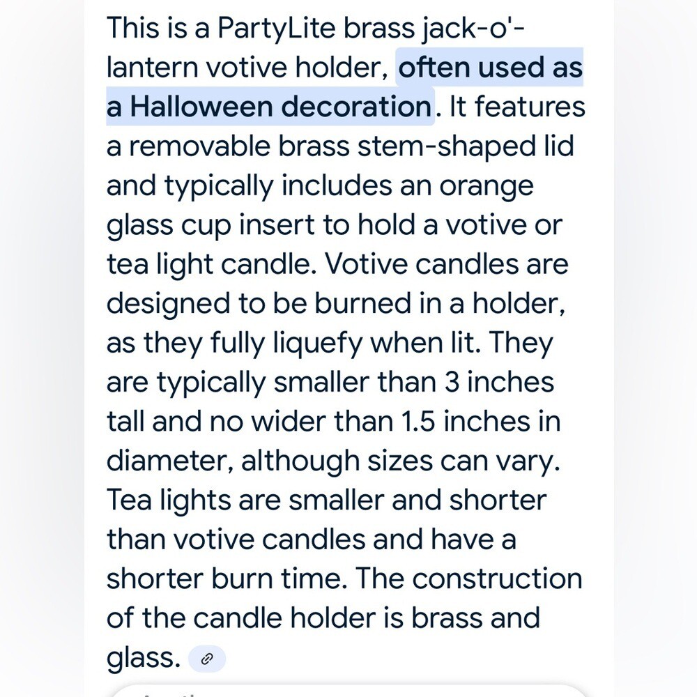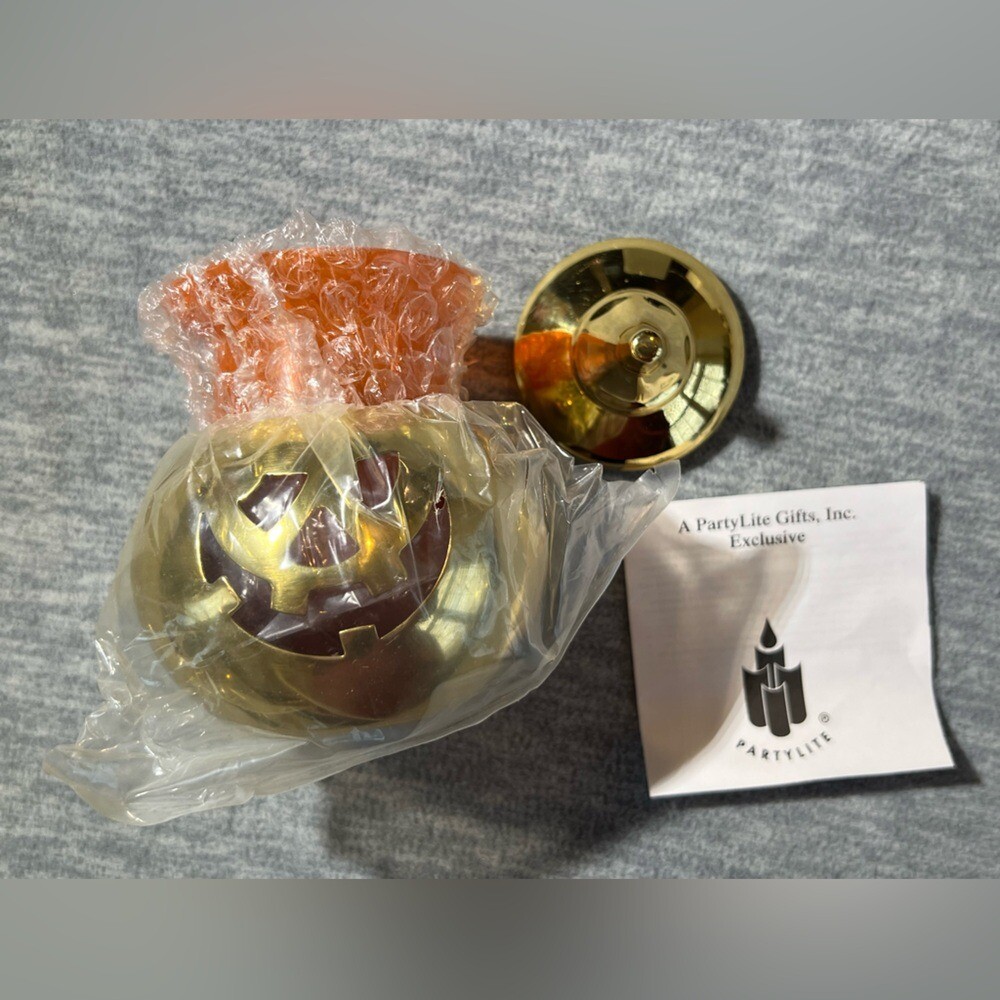 Partylite Jack-O-Lantern Brass PO138 Pumpkin Votive Candle Holder Retired Add a festive touch to your home with this brass -gold colored pumpkin candle holder. Also comes with a brass stem/topper and a glass orange votive holder that sits inside of the pumpkin. Features a cut out face so the candle light glows and shines through. Perfect for creating a warm, inviting atmosphere in your home, office, or anywhere you love decor Condition- appears to be new in box Size-about 5 inches high Color - pumpkin is brass/gold colored and inner votive cup is orange Material Content- blend of: Brass and glass My items are primarily thrifted and I do my very best to note any imperfections/callouts. Ships Next Day Monday - Friday My items are stored in a pet/smoke free home Thanks for stopping in and looking! Lisa