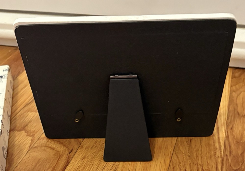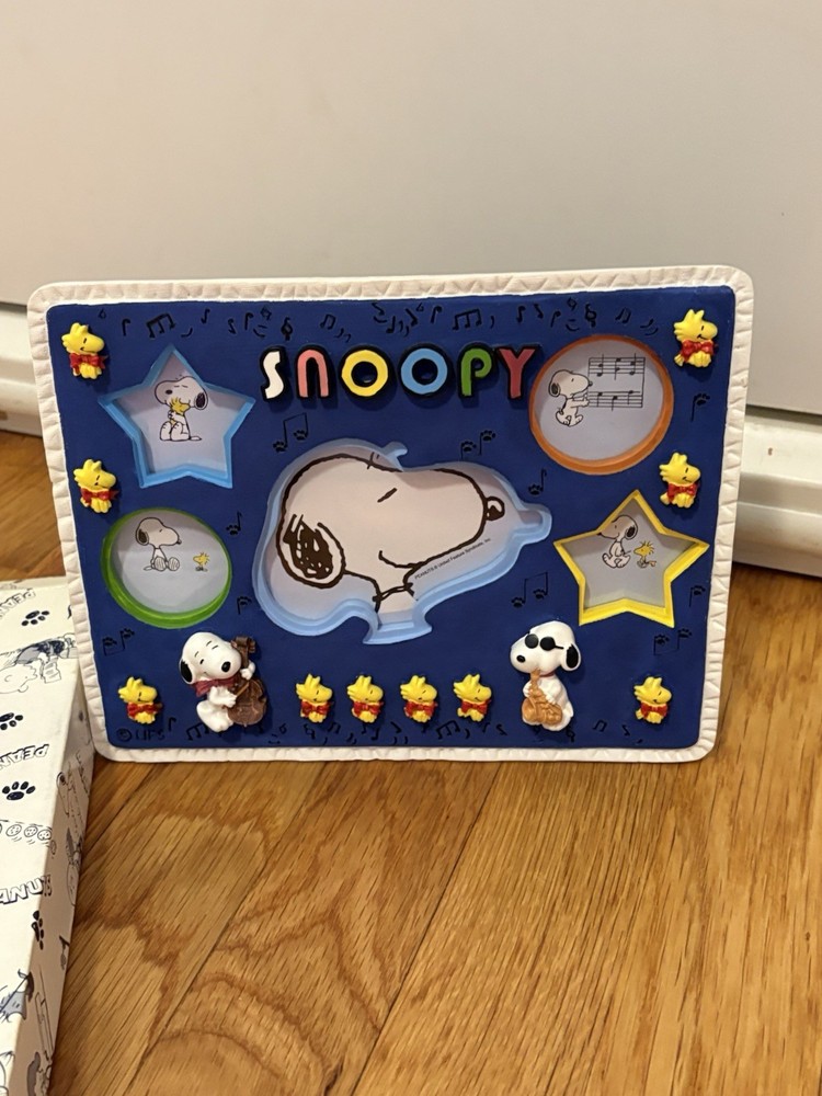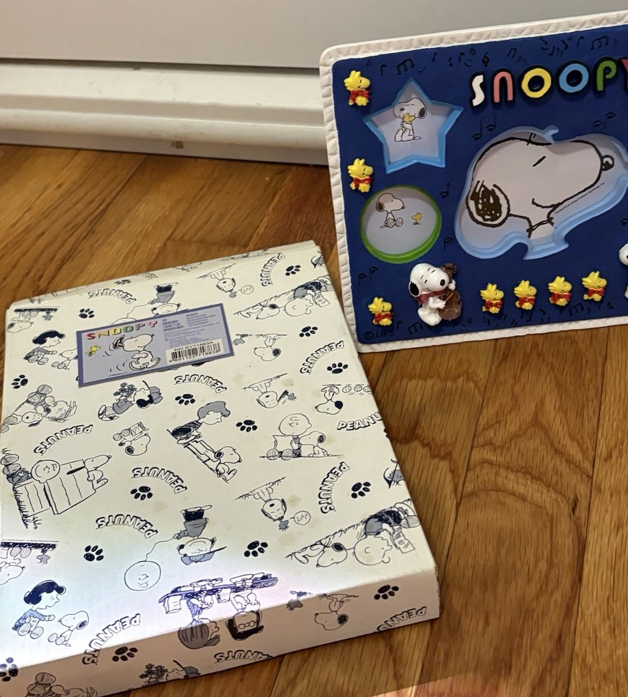 The product is a vintage Peanuts Snoopy and Woodstock sun hing picture frame manufactured in 1988. This collectible figurine features the beloved characters Snoopy and Woodstock in a multicolor design, made of mixed materials. The original licensing reproduction from Japan captures the essence of the animation franchise, making it a rare and sought-after item for fans of Peanuts. The frame comes in its original packaging, adding to its sentimental value for collectors of animation merchandise.