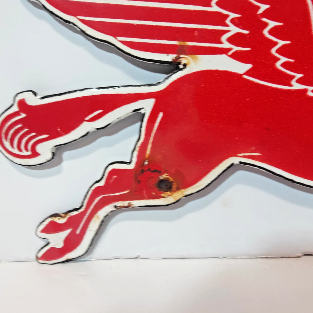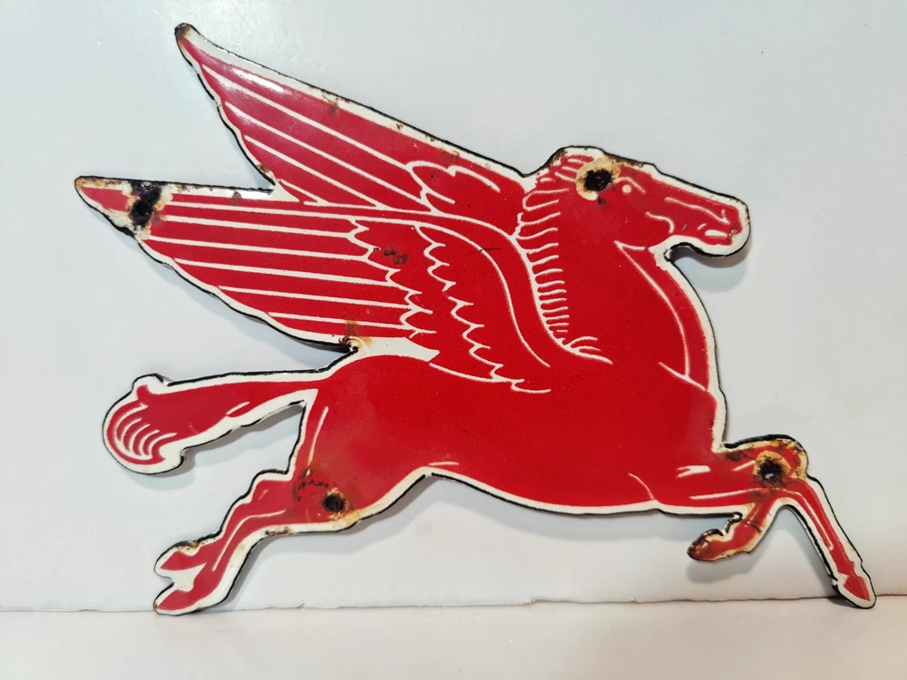 Capture a slice of history with this authentic Pegasus Red Horse Porcelain Enamel Metal sign, measuring a charming 9" x 5" inches. It's a genuine piece of Americana, representing the vibrantGas & Oil theme with its rich, red color and classic design. Originating from the United States, this sign is a testament to the enduring legacy of vintage advertising. Whether you're a collector of original signs or an enthusiast of unique decorative pieces, this sign brings a touch of nostalgia to any space. Its porcelain enamel construction ensures durability, while the intricate details preserve the allure of a bygone era. Display this emblem of the Pegasus brand and add an authentic vintage accent to your home or garage. * Kindly take a close look at all photos - they show the exact vintage sign you'll receive. What you see is truly what you get. * Carefully packed to protect the signs condition and shipped securely with USPS Ground Advantage