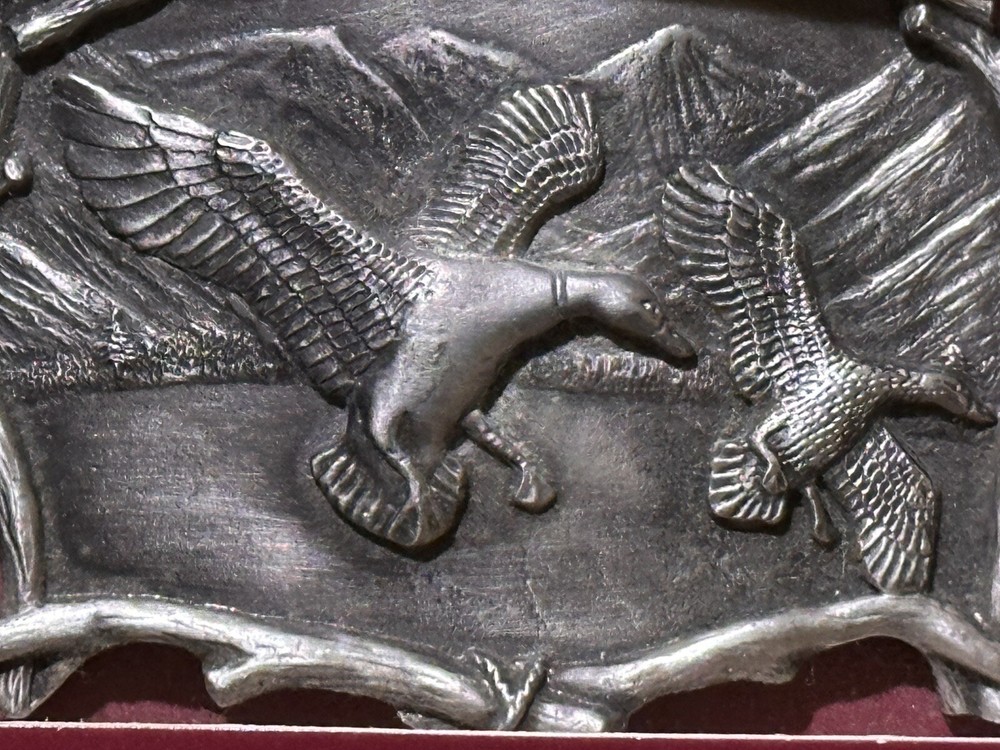 Add a touch of vintage to your wardrobe with this solid pewter tone belt buckle featuring ducks, geese, and the iconic Great American Buckle Company logo. Perfect for men who appreciate metal accents and unique accessories, this belt buckle is a must-have for any fashion-forward individual. The silver color and intricate buckle design make it a versatile piece that can be paired with any outfit. Made from high-quality pewter, this belt buckle is durable and built to last. Get ready to make a statement with this one-of-a-kind accessory.