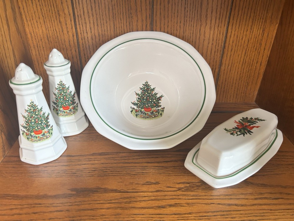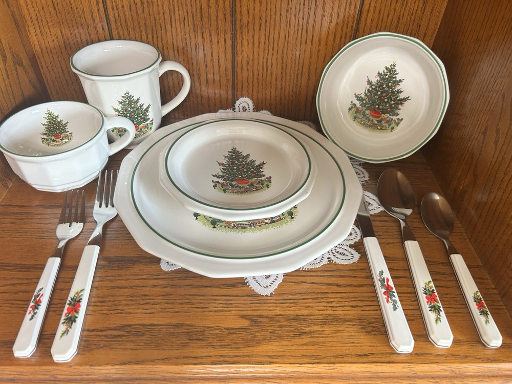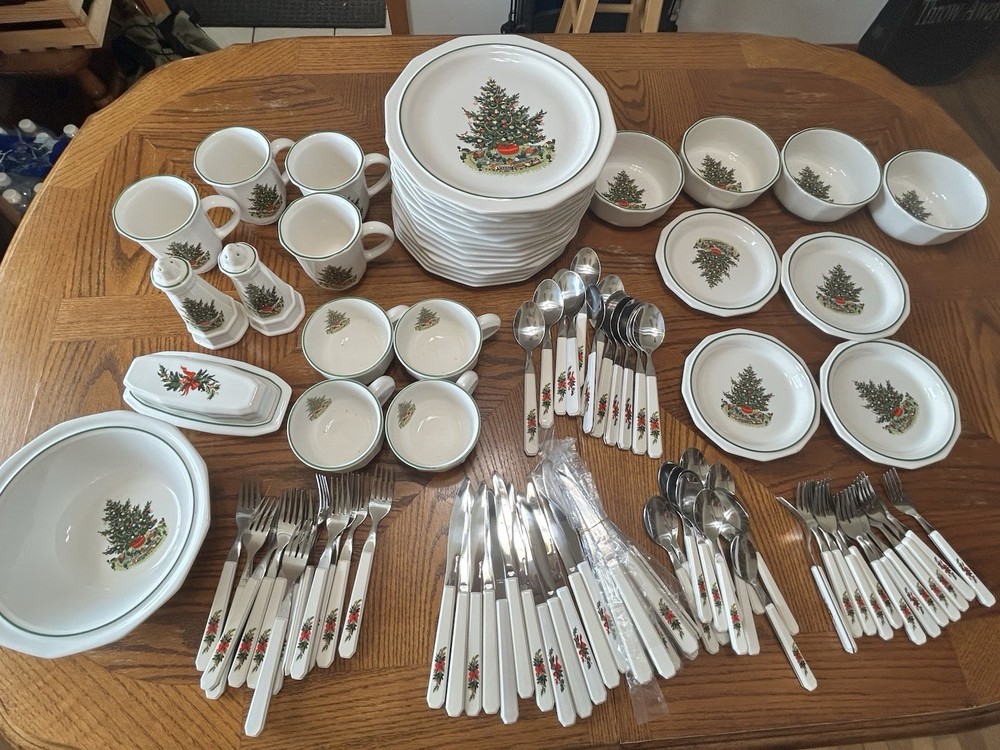 The Vintage Pfaltzgraff Collector Collection "Christmas Heritage" Dining Set is a festive and charming addition to any dining room during the holiday season. Made of durable stoneware and ceramic materials, this multicolor dining set features a Christmas theme that adds a touch of nostalgia to your holiday gatherings. With its classic design and American craftsmanship, this collection is sure to bring joy and warmth to your dining experience. Perfect for celebrating special occasions or everyday meals, this dining set is a timeless treasure that will be cherished for years to come. This set includes: 16 dinner plates 4 salad plates 4 bowls 4 mugs 4 saucers 1 serving bowl 1 salt and pepper set 1 butter dish Silverware includes: 12 large spoons 12 small spoons 12 large forks 12 small forks 12 knives 8 serrated steak knives