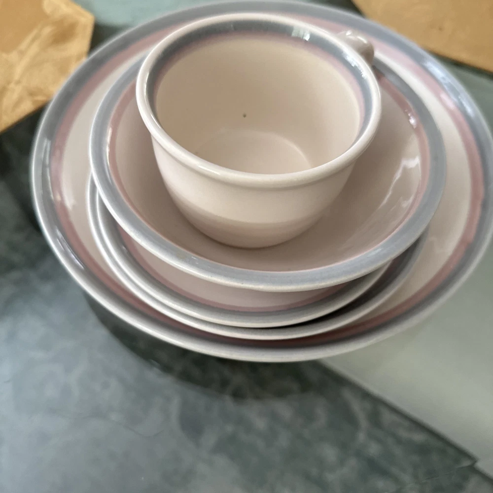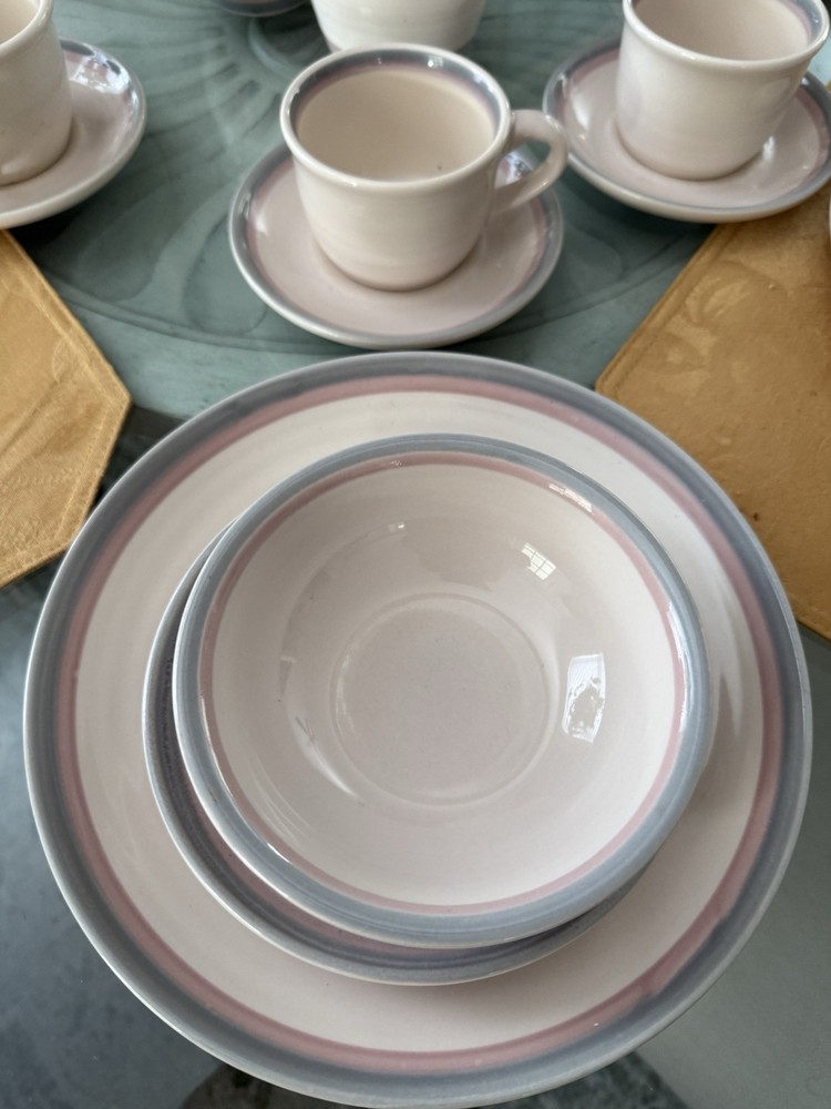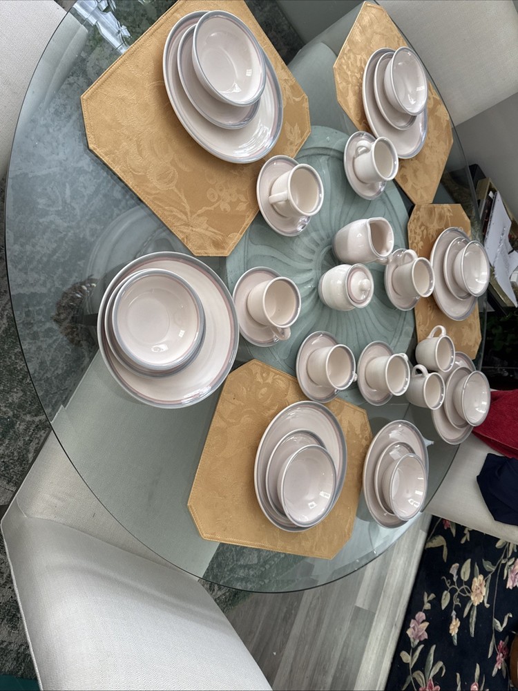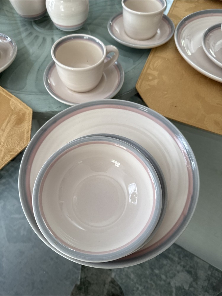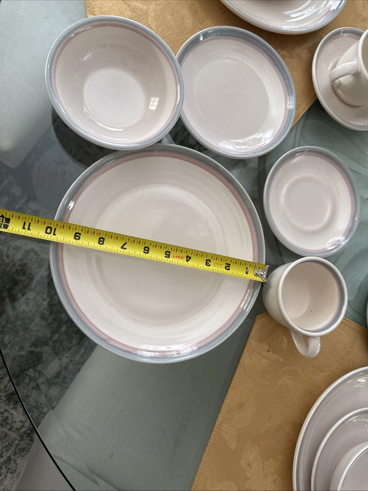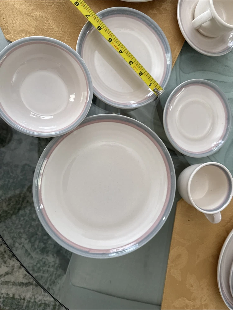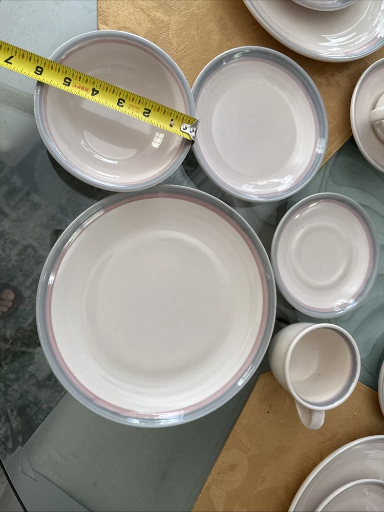 This Vintage Aura Pink Pfaltzgraff Dinner Set is a charming 37-piece set perfect for all occasions. Made of ceramic with a glossy finish, this round set features a beautiful pink pattern that exudes a vintage charm. The set includes various pieces such as dessert plates, dinner plates, cereal bowls, bread plates, and cups, making it ideal for hosting dinners or special gatherings. The Pfaltzgraff brand adds a touch of nostalgia to this set, which is sure to elevate any dining experience with its classic and timeless design. 7—-10”dinner plate 7——7” bread plate 7——6” cereal boul 6——6” saucer 8. —— coffee cups Sugar and creamer set Look at the pictures before making your purchase