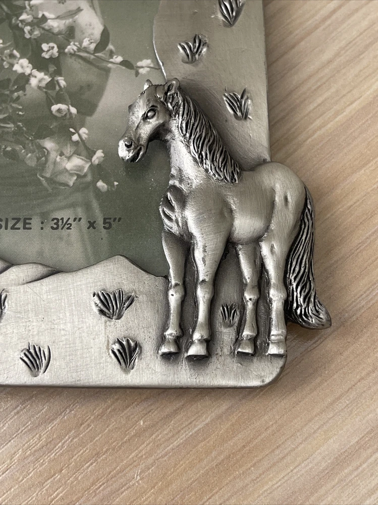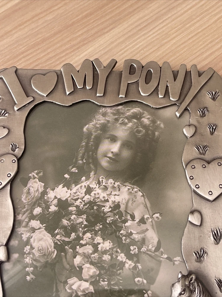 Vintage Photo Frame Love My Pony Western Hearts Horse 3x5 Easel Back Silver Sweet vintage photo frame. Great gift for the pony lover! The back easel needs regluing. Please see photos.