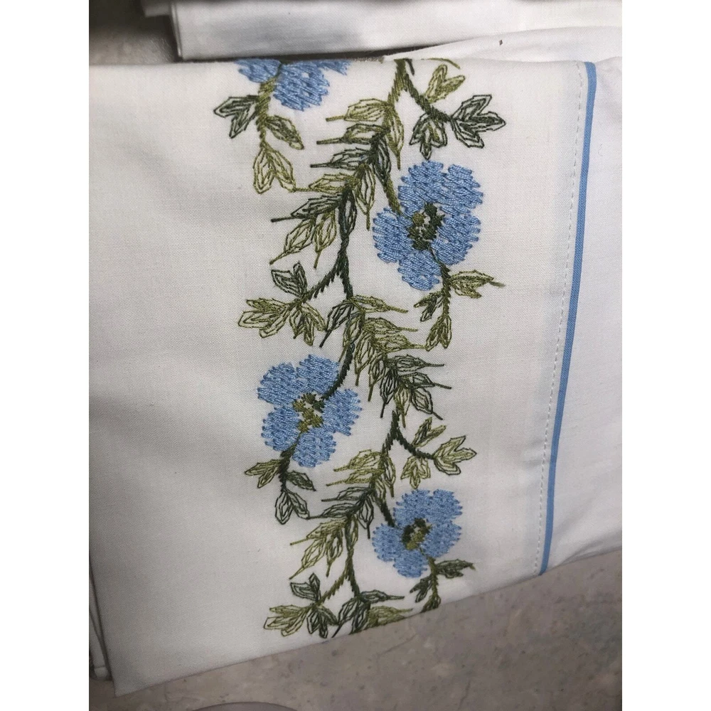 Vintage Pillowcases White with Blue Embroidered Flowers. Standard cotton New