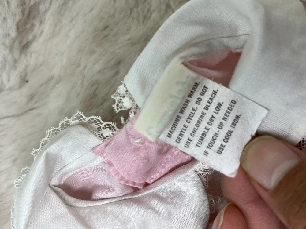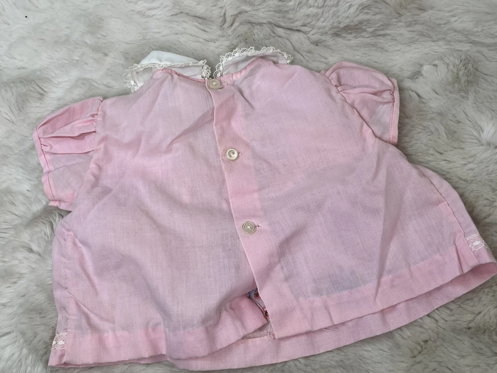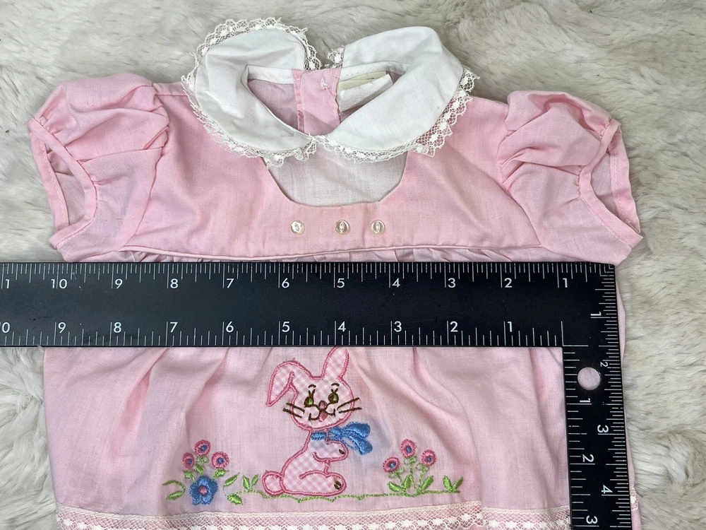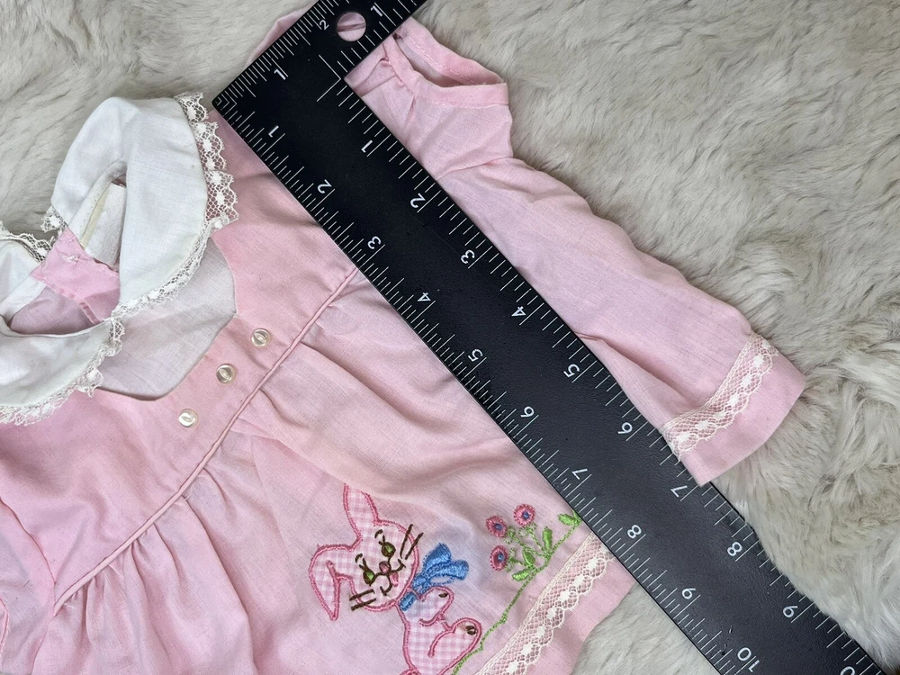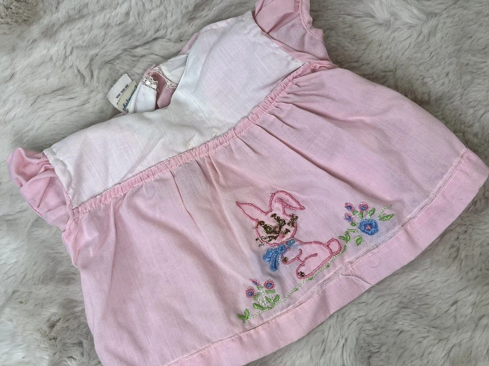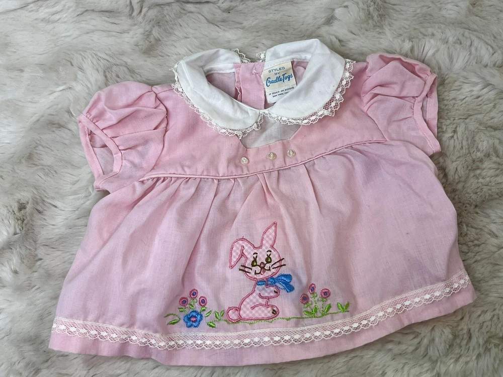 Dress up your little baby girl in this vintage pink Cradle Togs dress with an Easter Bunny design. The short-sleeved dress is made of a comfortable cotton blend material and is perfect for special occasions. The dress is embroidered with the cutest Easter Bunny design that will make your baby girl look adorable. This dress is perfect for children aged 0-3 months and is a great addition to any vintage-loving parent's wardrobe. The dress is from the 1980s and is an excellent representation of the time period. Get your hands on this lovely dress and make your baby girl stand out from the crowd. No stains