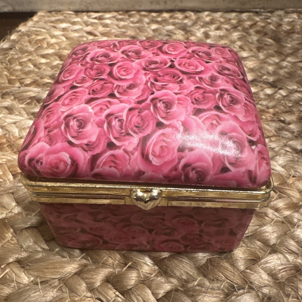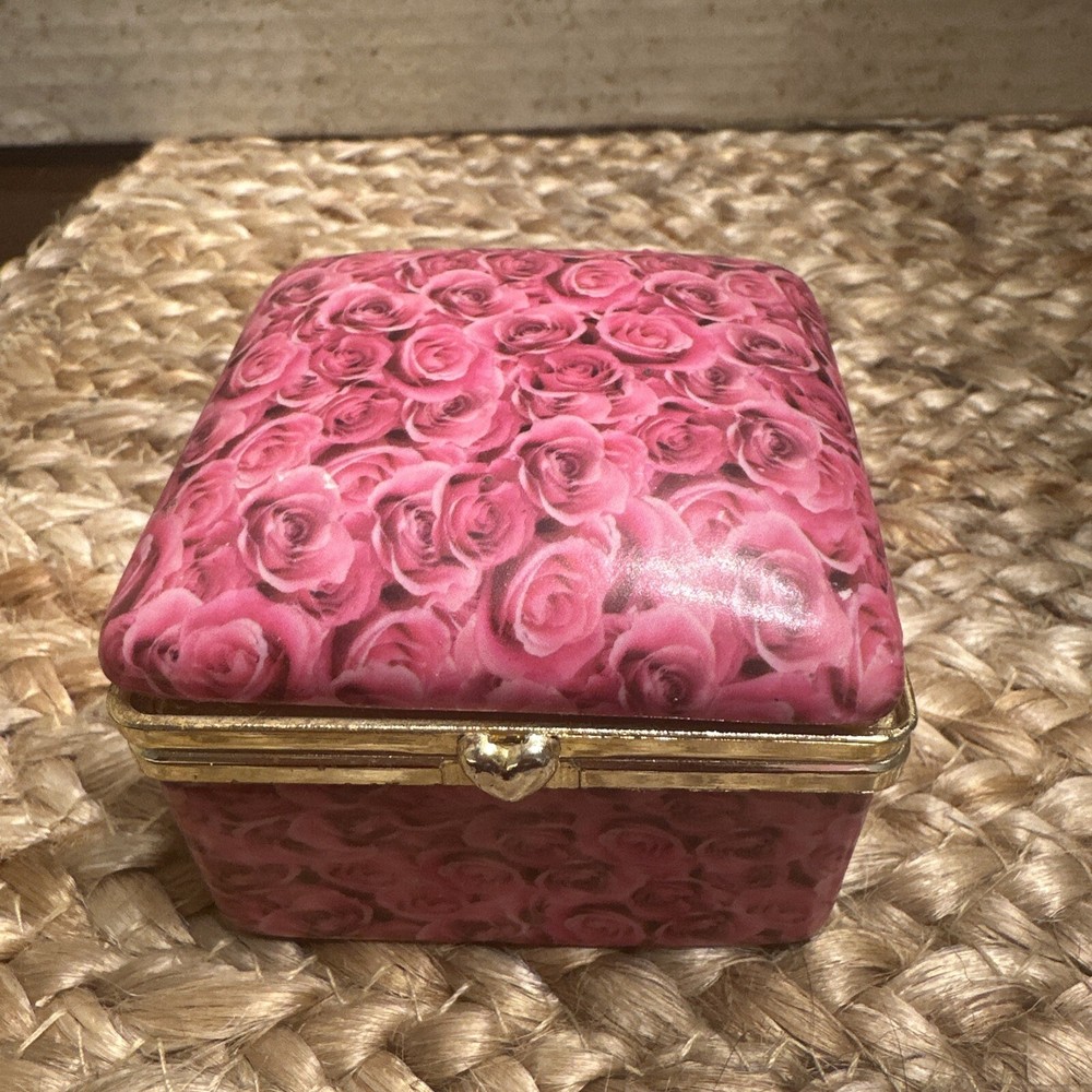 This vintage trinket box is a beautiful addition to any collection. The box features a lovely pink rose pattern and is hinged for easy access. Measuring at 2.5 inches in length, it is a small and perfect size for storing your favorite items. The box comes in a lovely gift box, making it a great option for a collector or as a gift for a loved one. The box is perfect for storing small items, such as jewelry or paper clips, and will add a touch of elegance to any room.
