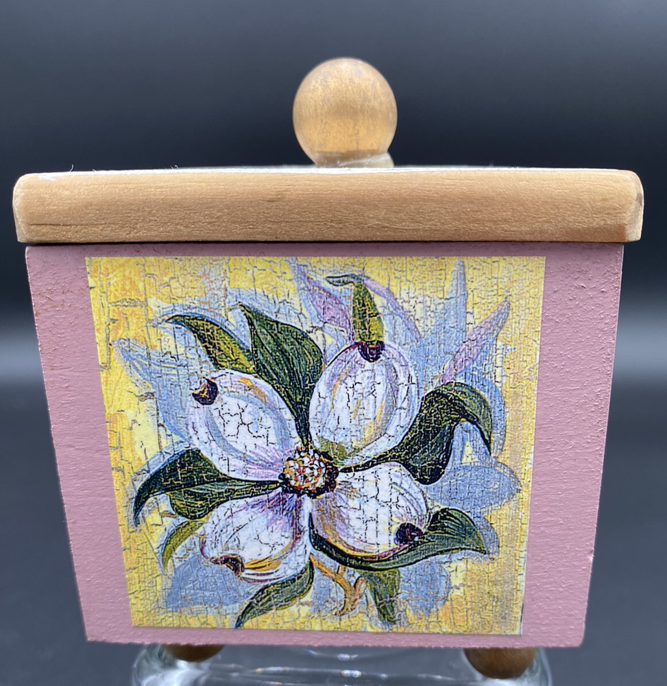 This vintage wooden keepsake box is a one-of-a-kind treasure designed by Constance A. Guerra. The front piece is a floral wreath surrounding the words, "Forever Friends". The other three sides are purple irises, dogwood blossoms, and white peonies. The lift-off top has a a gold and white crackle finish. It is perfect for storing small trinkets and mementos. The square shape and 4.5-inch height make it a charming and manageable addition to any room. Measuring 3.25 inches wide and weighing just 4 ounces, this box is both decorative and functional, featuring a friendship theme that's perfect for all occasions. The keepsake box is in very good condition. There are no chips, cracks or signs of wear.