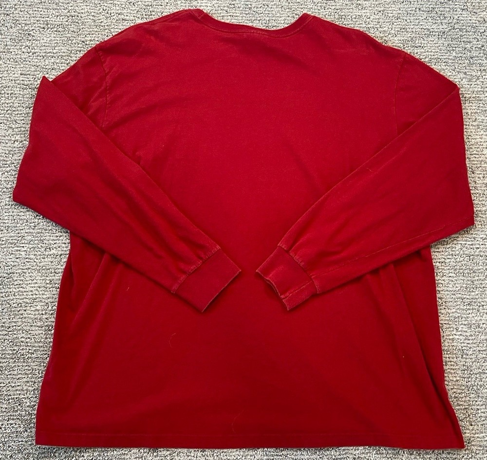 This Vintage Polo Ralph Lauren Men's 2XL Red Long Sleeve T-shirt features a classic crew neckline and a regular fit, making it perfect for casual wear. Made of cotton knit fabric, this shirt is machine washable for easy care. The vintage design includes faded black accents, embroidered logo, and the iconic Polo Ralph Lauren pony logo, adding a touch of retro style. Ideal for the 90s, preppy, and classic themes, this T-shirt is suitable for all seasons, making it a timeless addition to any wardrobe.