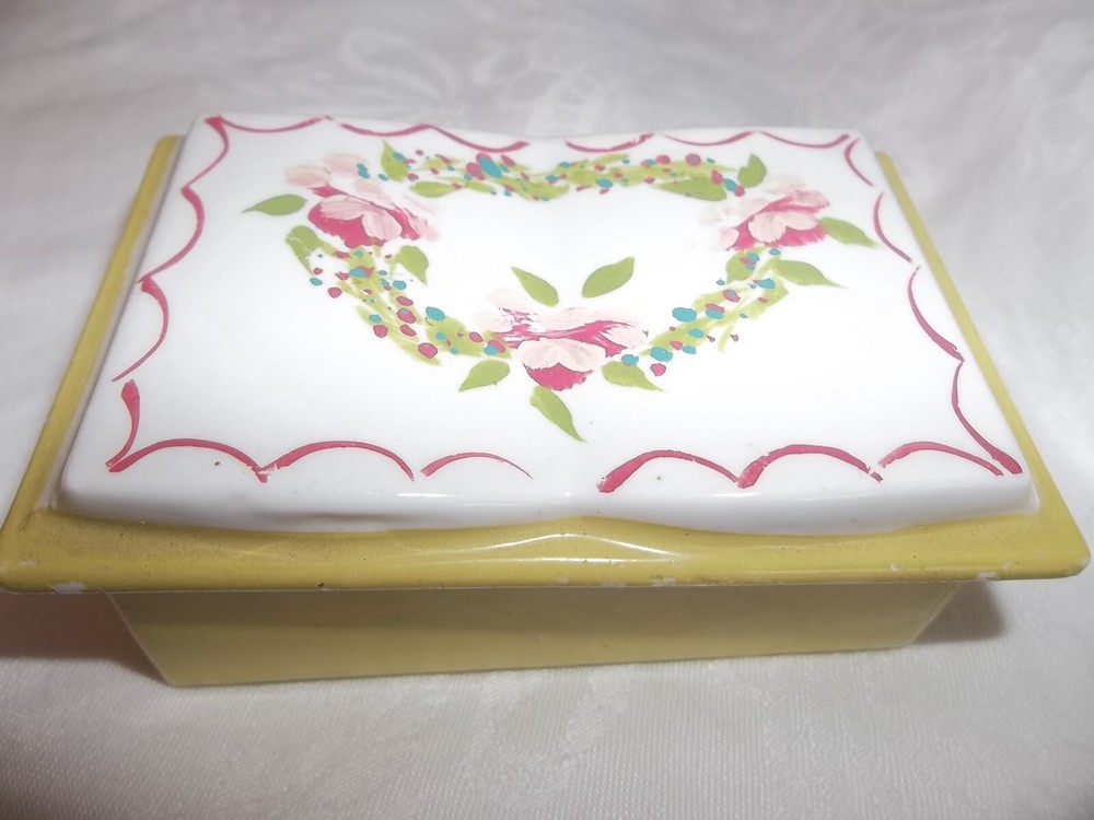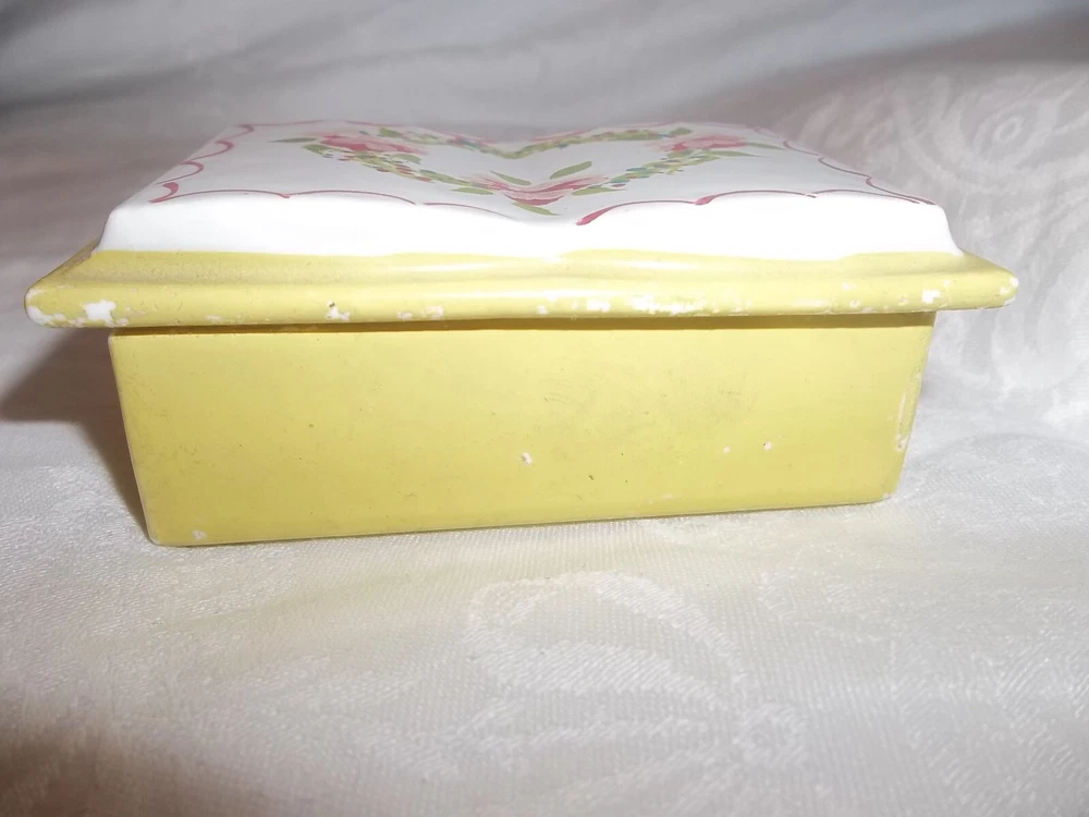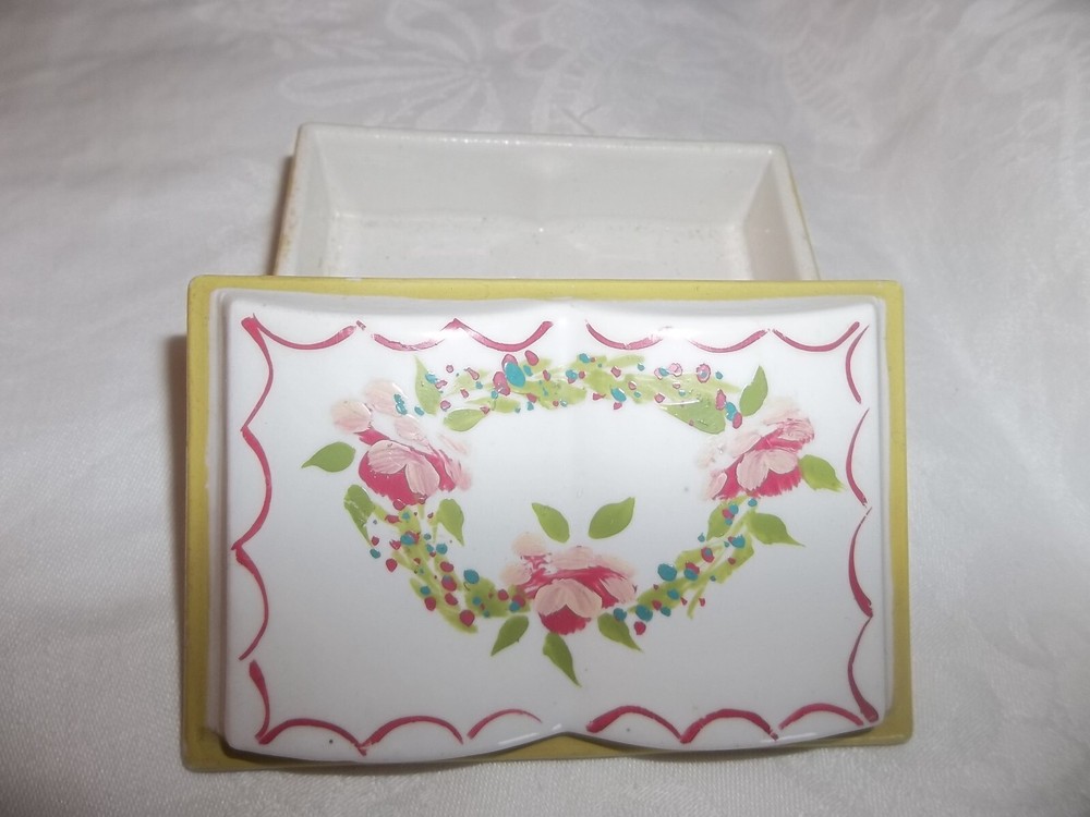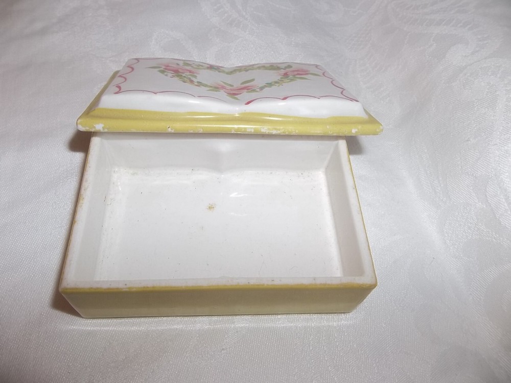 Porcelain Vintage Trinket box w/ lid Classic open book-Shaped yellow Trinket Box Pink Roses on top 3.5x2"