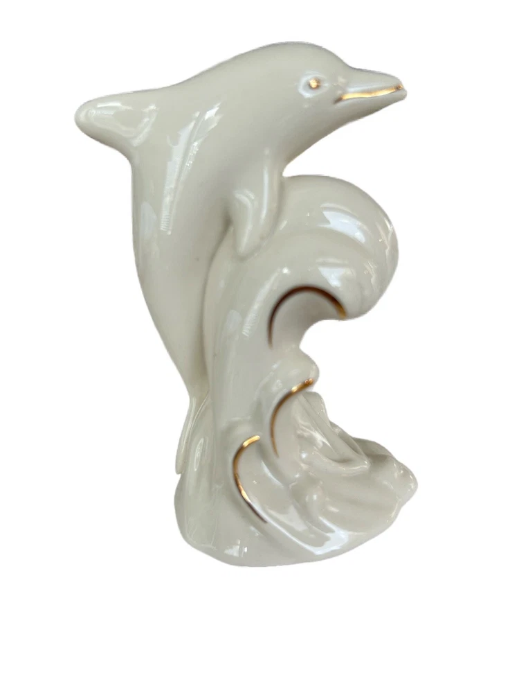 This vintage Lenox porcelain figurine features a beautiful ivory gold color with a high gloss finish. The figurine depicts a dolphin with a gold trim and is perfect for any room or occasion. It was manufactured in China in the 1980s and is an original piece from the brand's animal collection. The figurine is small in size and features an all-over pattern with a nautical and animation theme. It is suitable for adults and does not come with any signs or character family. This piece is a great addition to any decorative collection and is sure to enhance any space. Good condition