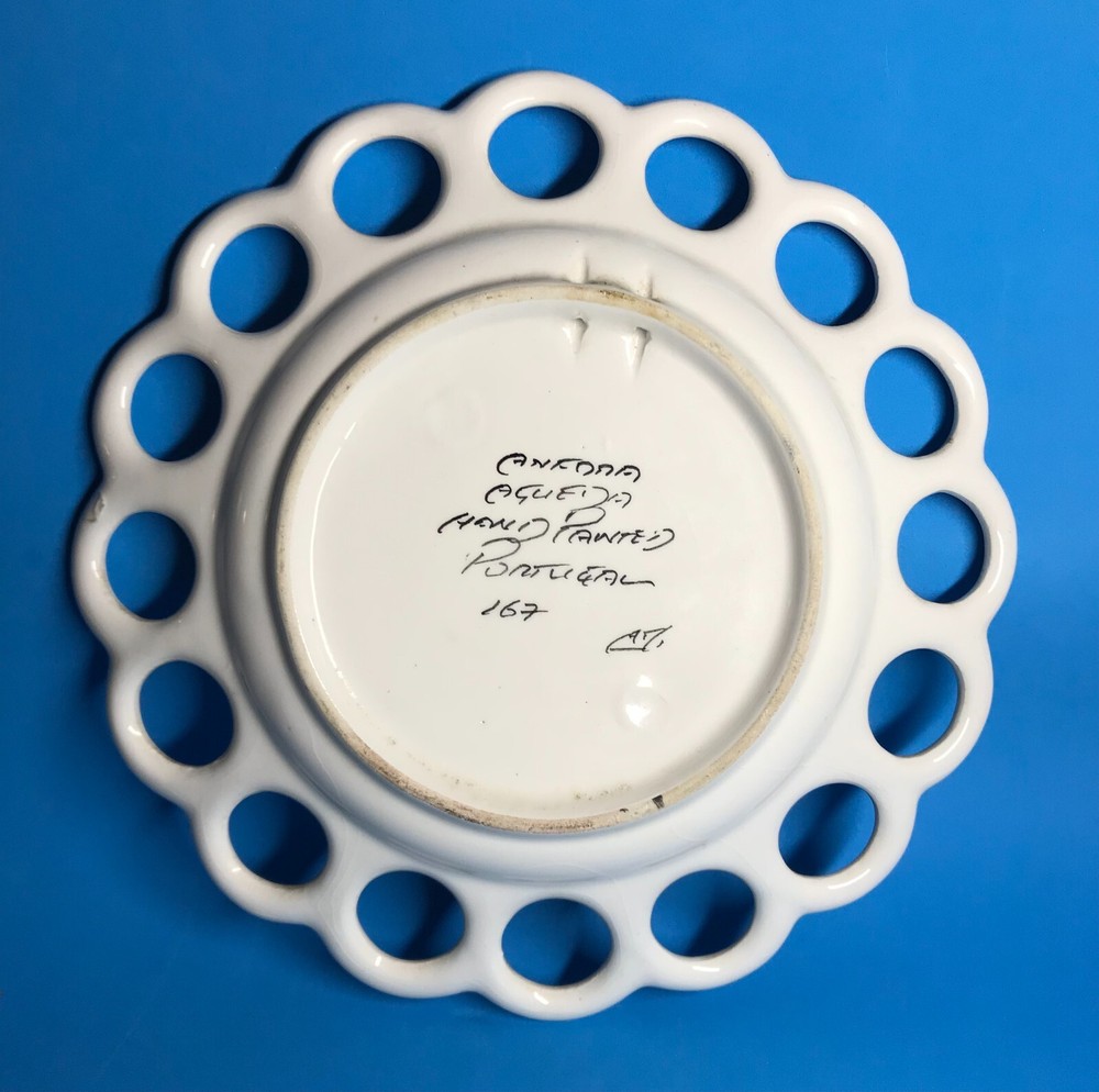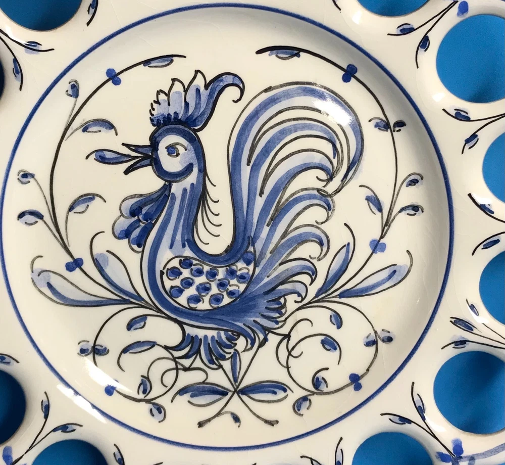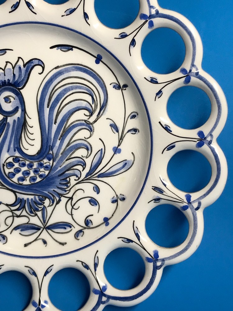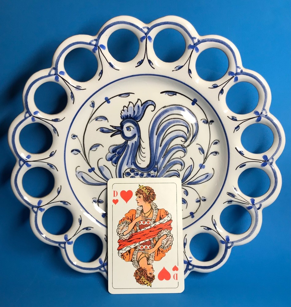 FROM MADEIRA WITH LOVE.... Found in an estate liquidation on the island of Madeira in Portugal, that of a retired antiques dealer. Vintage Portuguese pottery wall plate. A classic blue and white hand painted image of a rooster is the center motif. Finished with a scalloped open work rim. The rooster has been considered the unofficial mascot of Portugal for decades. Found in a wall display of antique and vintage plates, It has survived free of chips or cracks, no abrasions. The plate measure 8 inches in diameter and has a pierced back rim making it easy to hang without a plate holder. I inserted a standard size playing card in one photo as a reference for size. MUCH OBLIGED