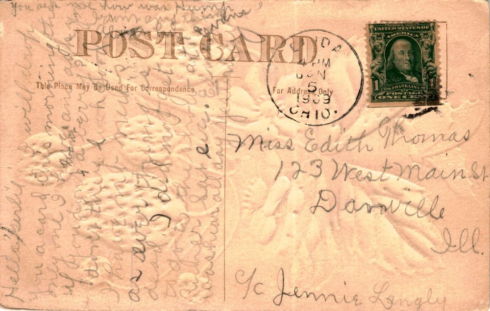 MAKE AN OFFER. THE MORE YOU BUY THE BETTER DEAL I WILL ACCEPT The postcard is dated 1909 and addressed to Miss Edith Thomas in Danville, Illinois, from Jennie Longly. The text on the postcard is a bit unclear but seems to mention Charlotte and an aunt. The sender may be asking about someone's well-being and mentions not receiving a card.