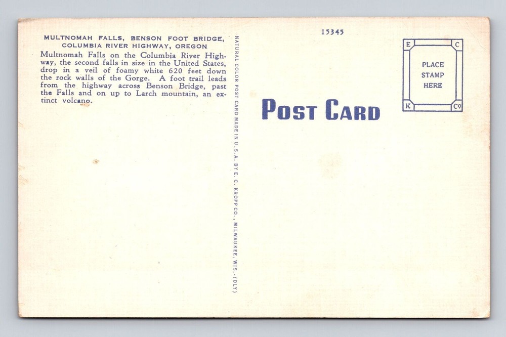 This vintage postcard of Multnomah Falls and the Columbia River Highway is a stunning piece of Oregon history! The image captures the iconic footbridge beautifully, and the quality is fantastic—sharp details and rich colors. Shipping was fast, and the card arrived in perfect condition thanks to the protective sleeve and sturdy mailer. Great addition to any postcard collection or as a unique gift for nature lovers. Highly recommend this seller for their careful packaging and excellent service!
