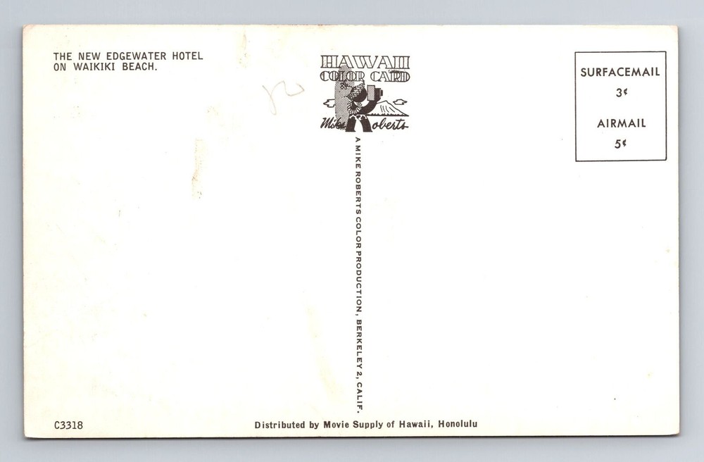Vintage Postcard of Waikiki Beach HI New Edgewater Hotel Souvenir