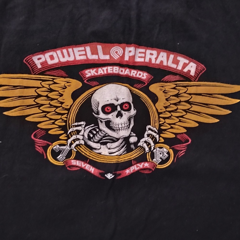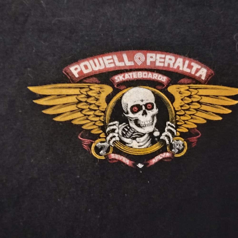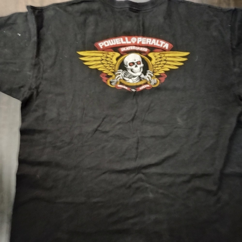 The product is a Powell Peralta Skateboards tee in size XL. This black t-shirt is designed specifically for men and is made by the well-known brand Powell. The regular fit of the tee makes it comfortable for everyday wear, perfect for any skateboarding enthusiast looking to show off their style while representing their favorite brand.