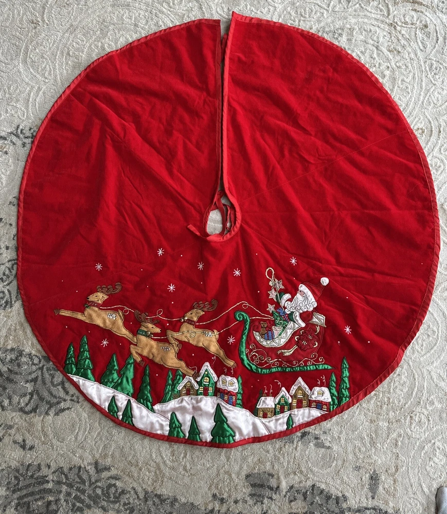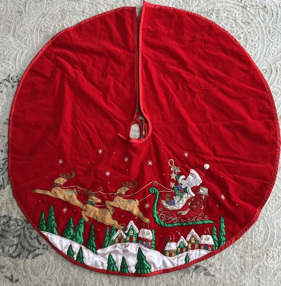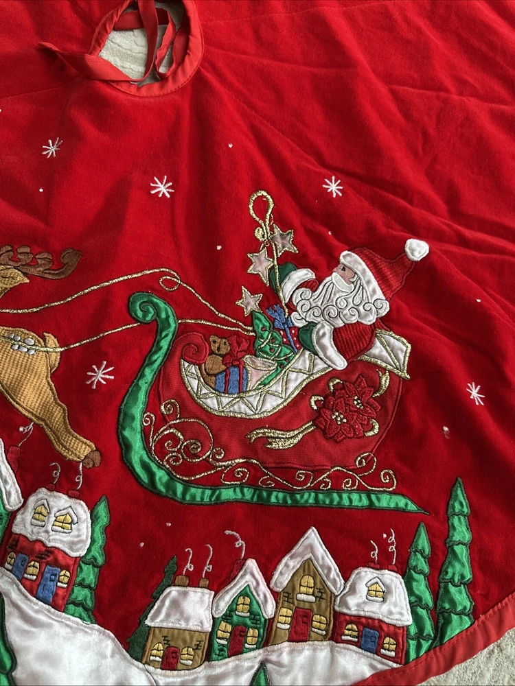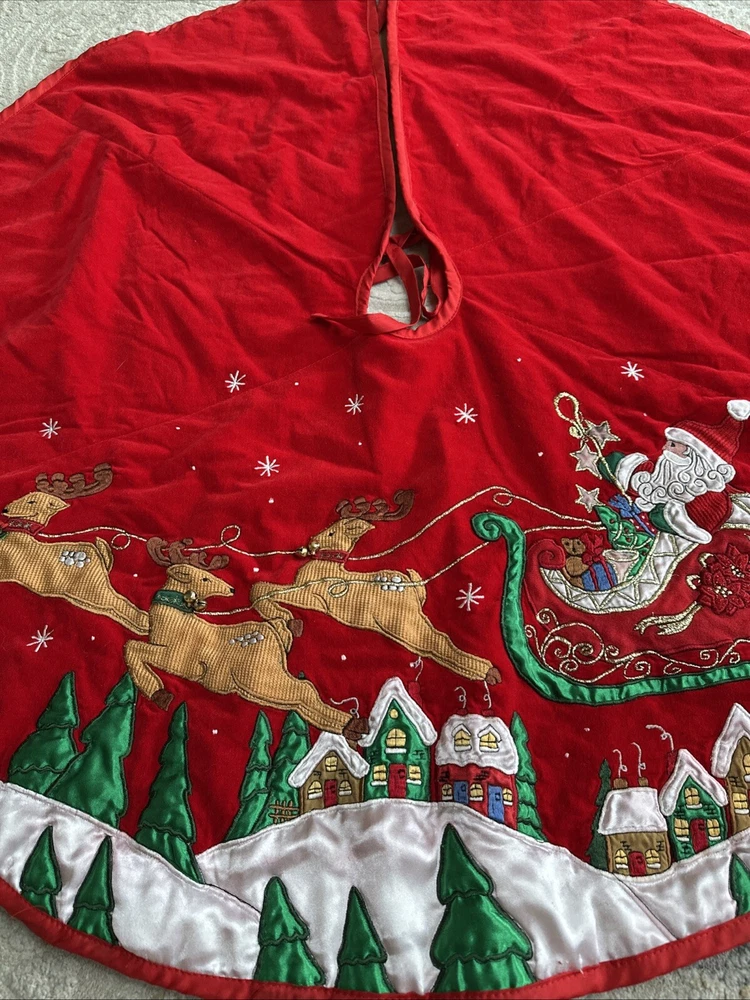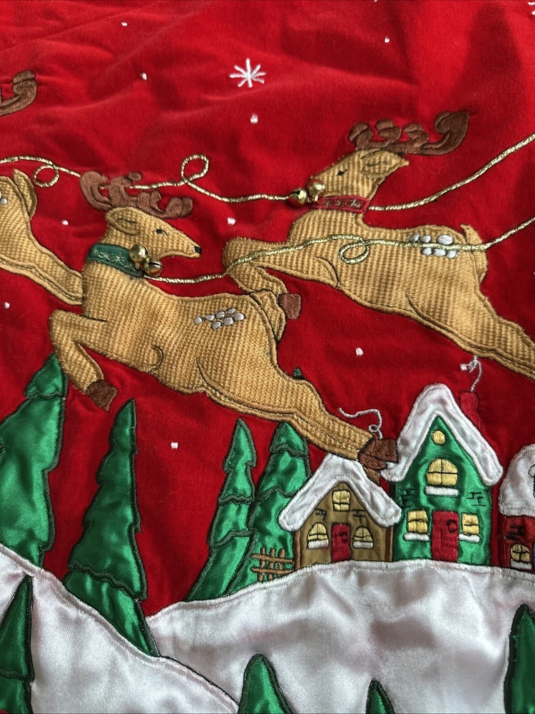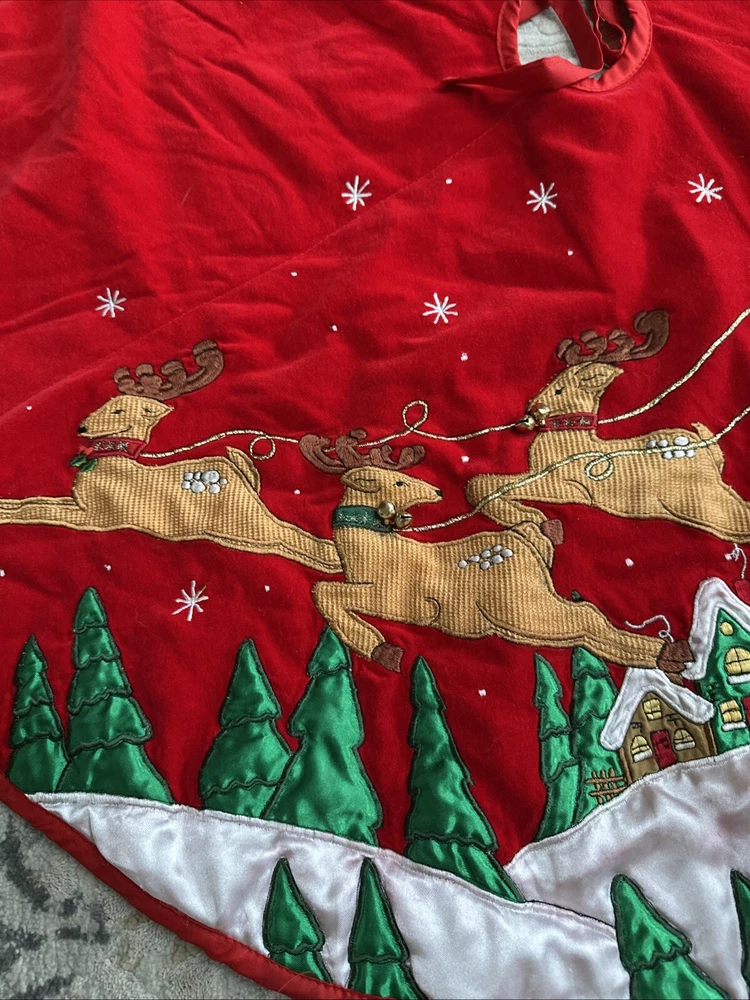 Vintage Prima Creations Santa Reindeer Bells Embroidered Tree Skirt Gorgeous . Condition is Used. Shipped with USPS Ground Advantage.