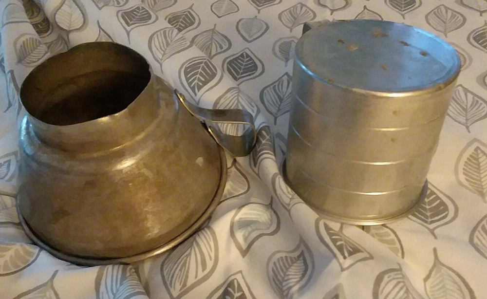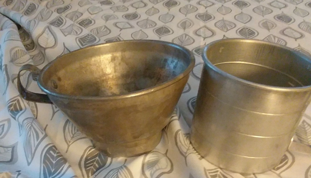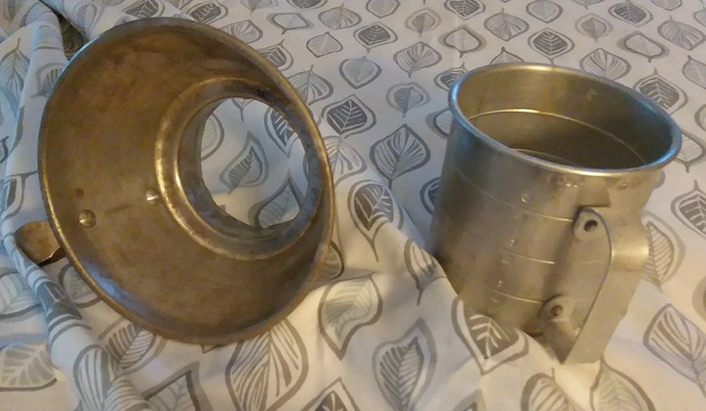 This vintage aluminum canning funnel is a must-have for your mid-century modern kitchen collection. It measures liquids with ease and precision, making canning even more enjoyable. The silver funnel is in its original condition and has not been modified or handmade. It is a rare find for collectors of unique kitchen items. The funnel is from the 1950s and was manufactured in the United States. Its material is aluminum, and it has a sleek design that fits the mid-century modern style. This canning funnel is perfect for adults who love to cook and collect vintage kitchen items.