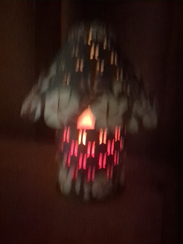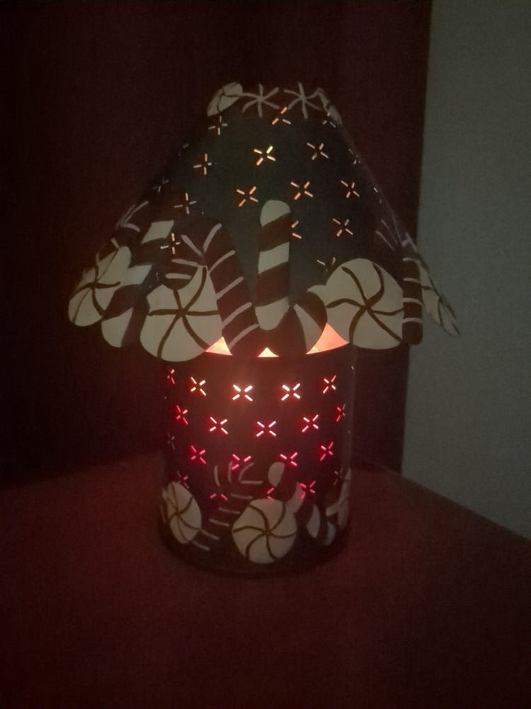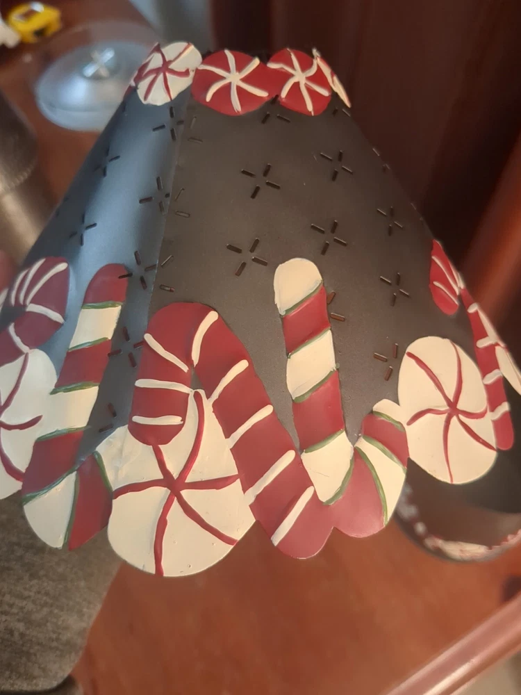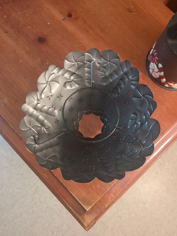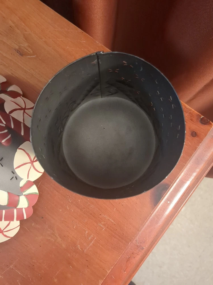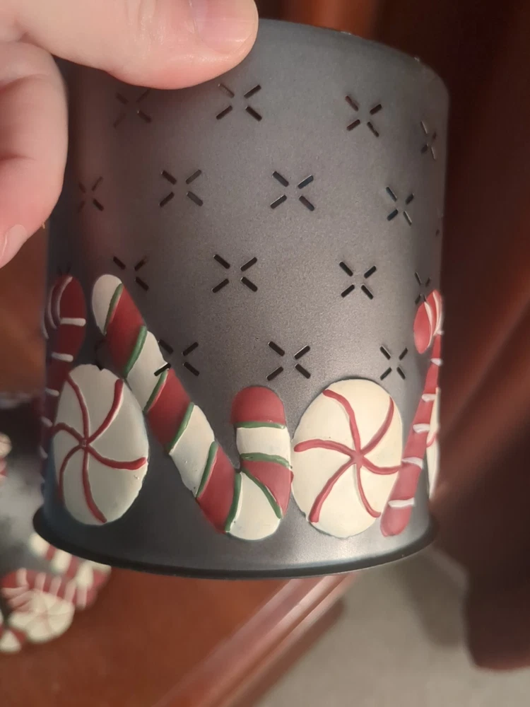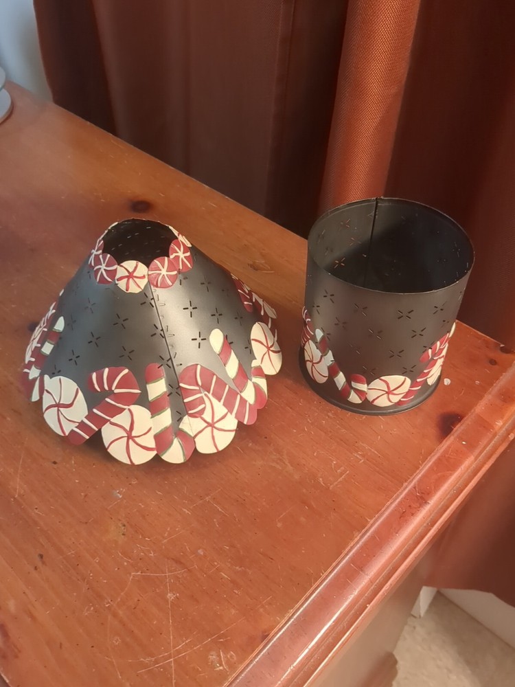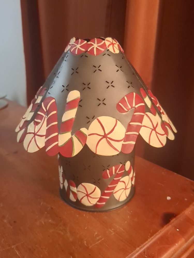 PUNCHED TIN HOLDS 22OZ CANDLES OR SMALLER HAND PAINTED CANDY CANE SHIPPED WITH CARE Add a touch of vintage charm to your Christmas decor with this handmade punched tin holder and shade. The round shape and gray color of the shade make it a perfect fit for any room in your house. The shade is marked with a wheat motif and early American design, adding a touch of colonial style to your home. This medium-sized holder is suitable for 22 oz candle jars or smaller and has a diameter opening of 4.25 inches. The metallic finish and handmade construction make it a unique and original addition to your decorative collectibles. This vintage piece is perfect for anyone who loves fairy lamps, farmhouse decor, or colonial-era items.