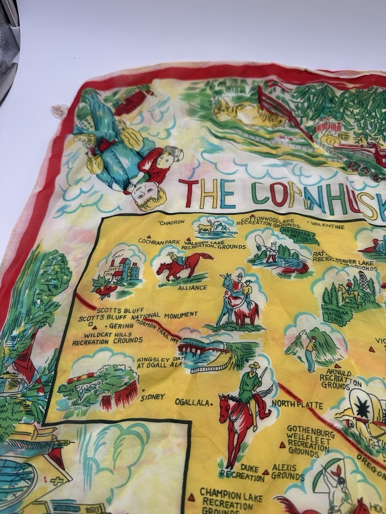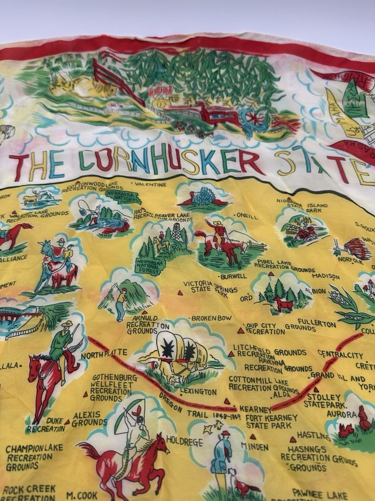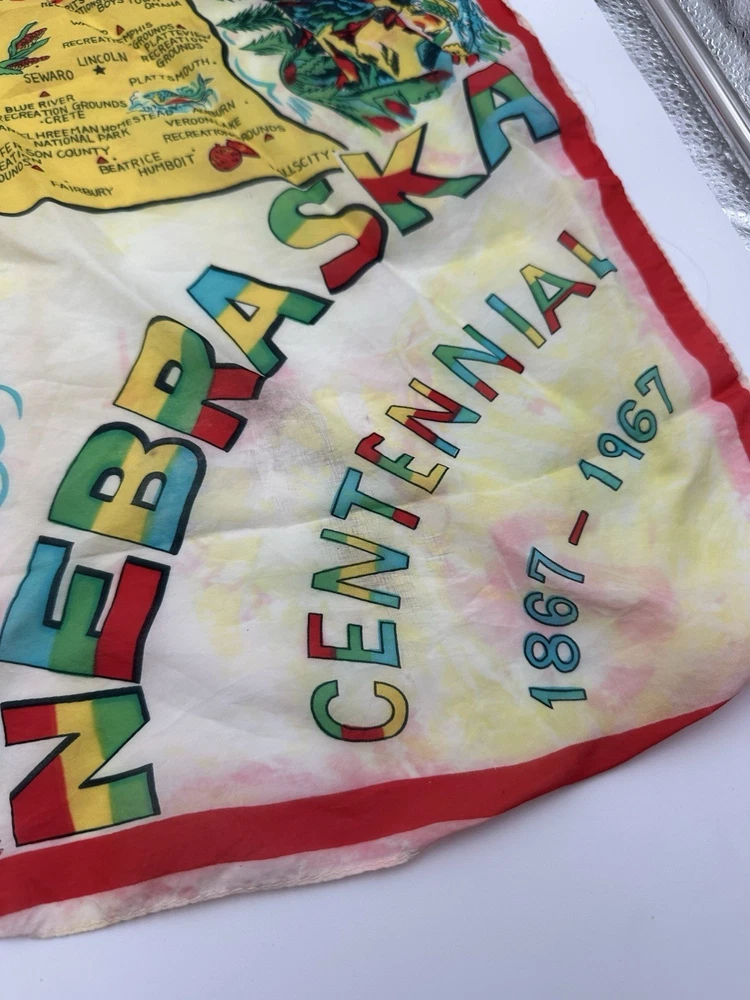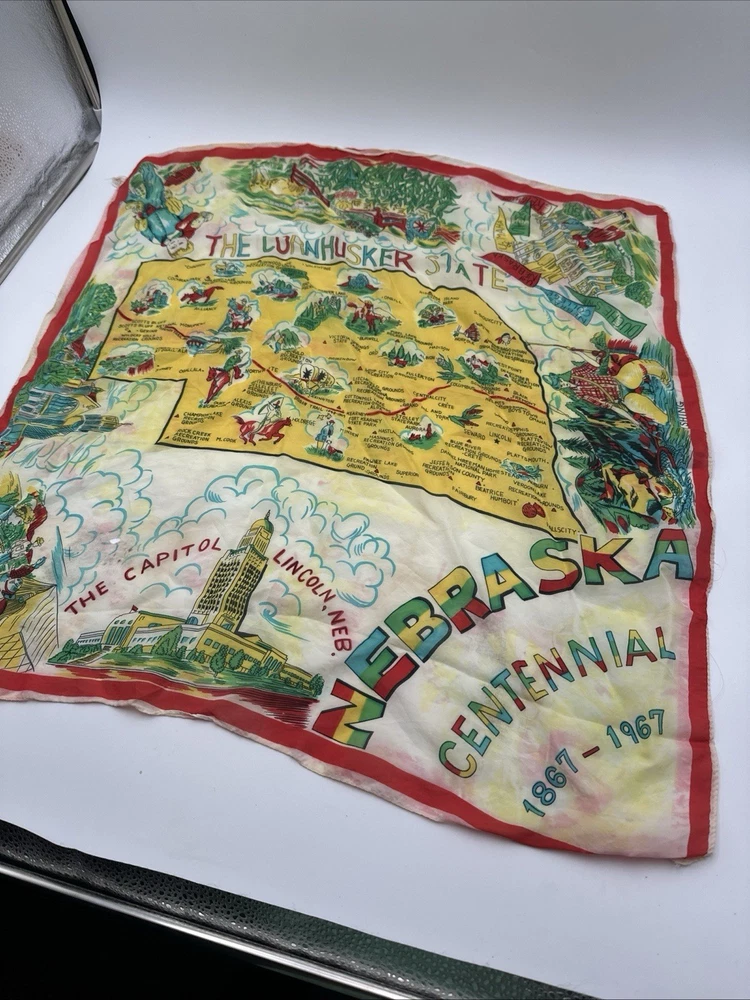 This Vintage Pure Silk Souvenir Scarf commemorates the Nebraska Centennial in 1867-1967. Made of high-quality silk, this scarf is a unique and elegant piece of travel memorabilia. Perfect for collectors or those looking to add a touch of vintage charm to their accessories, this souvenir scarf is sure to be a cherished item for any fan of United States history and craftsmanship. See pics for description. It does have a couple of holes in it. Sold as is very nice vintage piece.