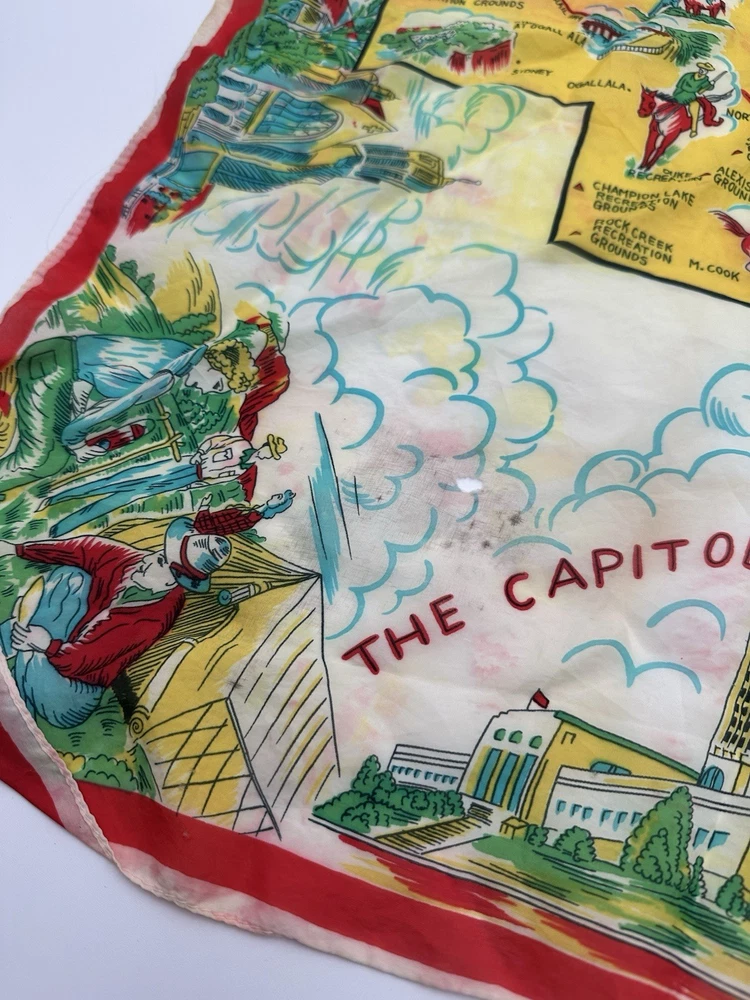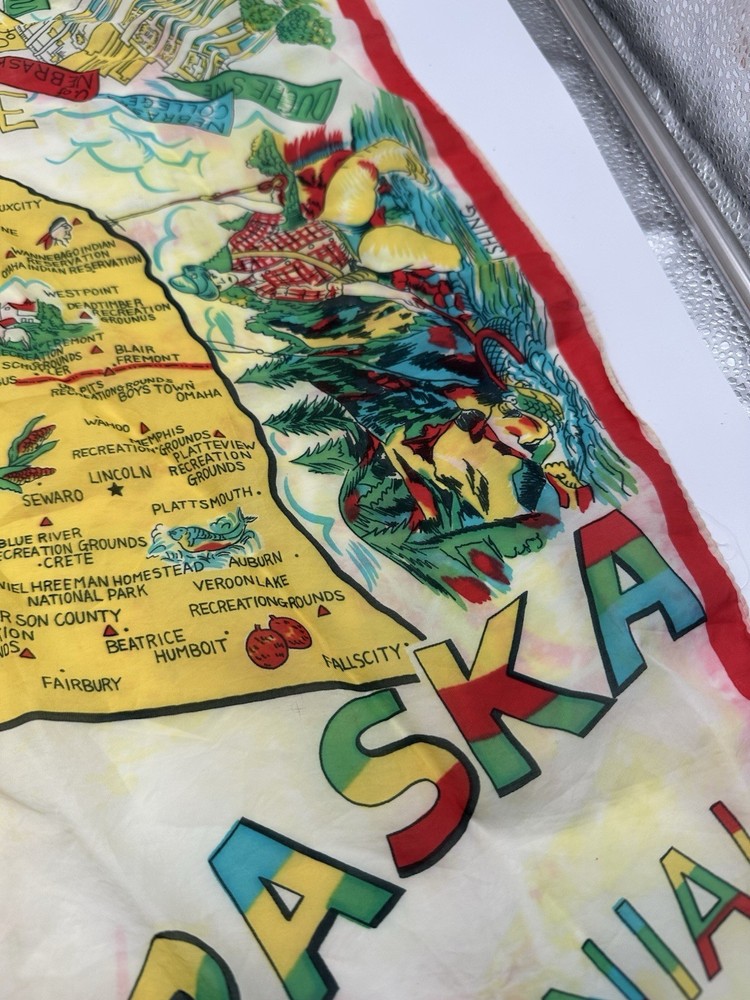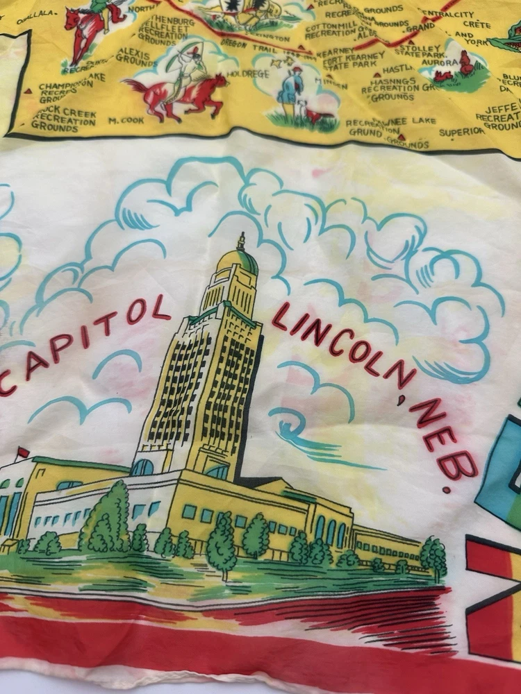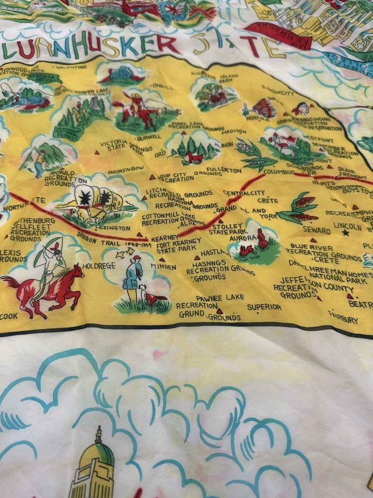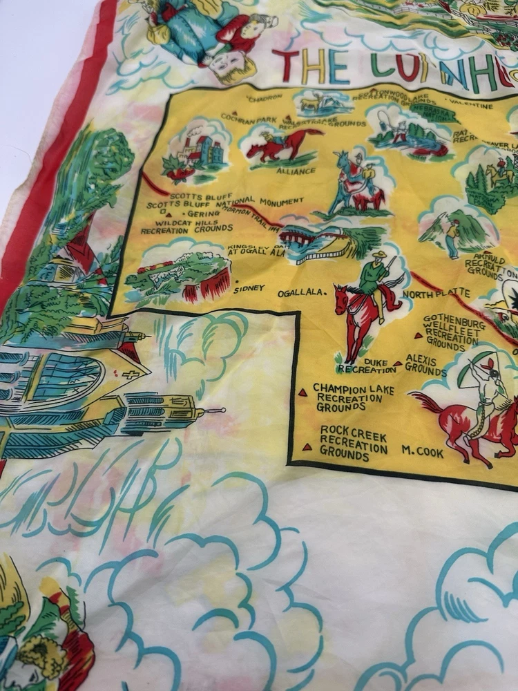 This Vintage Pure Silk Souvenir Scarf commemorates the Nebraska Centennial in 1867-1967. Made of high-quality silk, this scarf is a unique and elegant piece of travel memorabilia. Perfect for collectors or those looking to add a touch of vintage charm to their accessories, this souvenir scarf is sure to be a cherished item for any fan of United States history and craftsmanship. See pics for description. It does have a couple of holes in it. Sold as is very nice vintage piece.