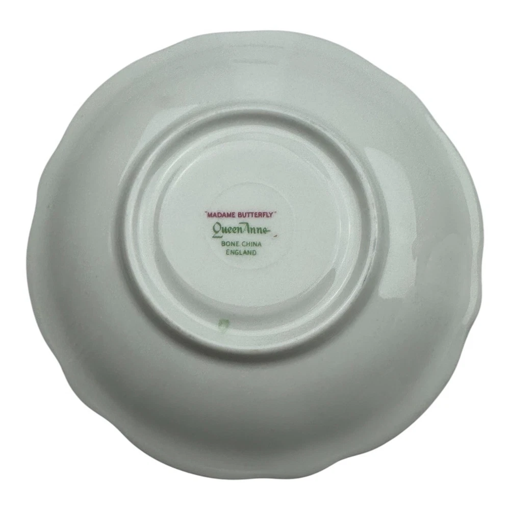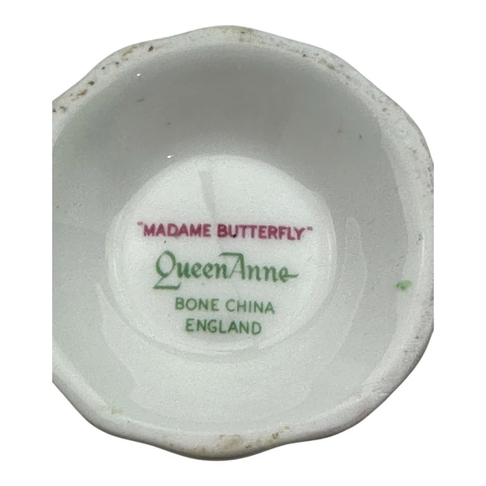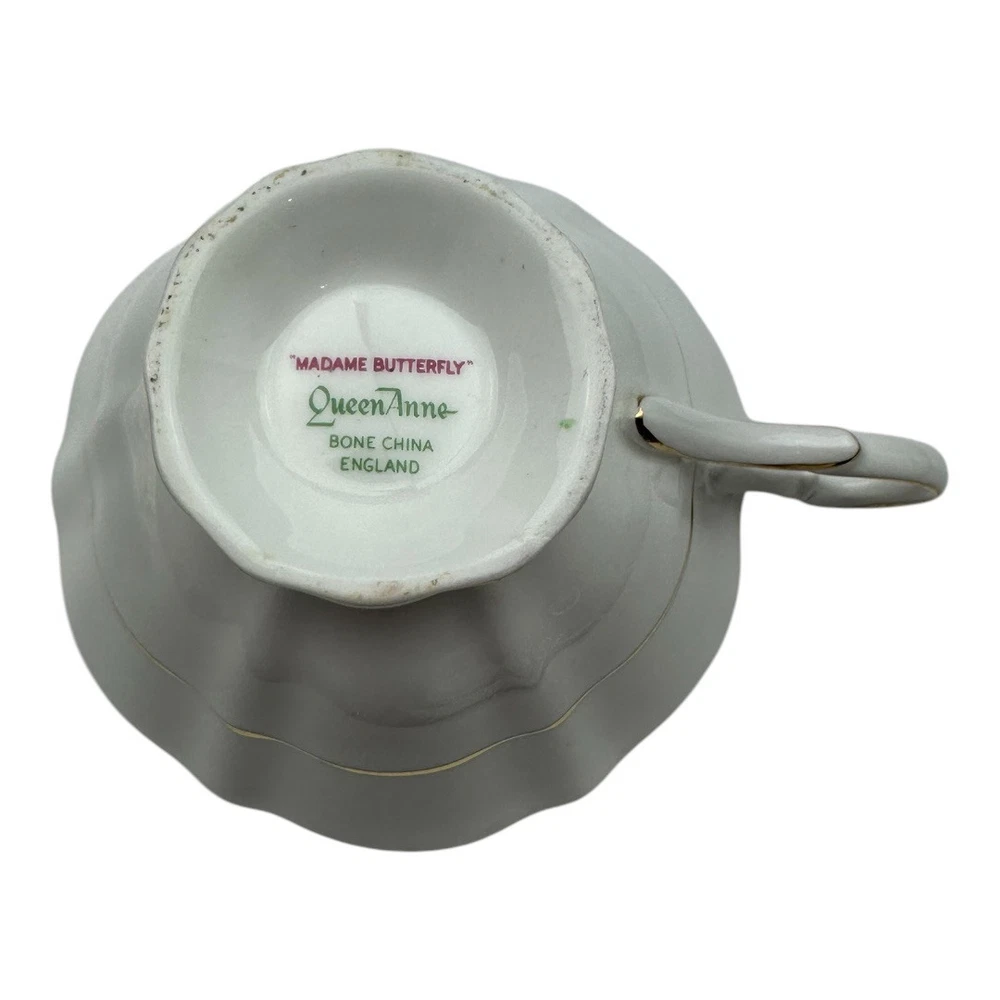 Queen Anne Madame Butterfly Tea Cup And Saucer Condition as shown in the photos 2.5” tall x 5” handle to edge of the rim 6” diameter saucer 2575