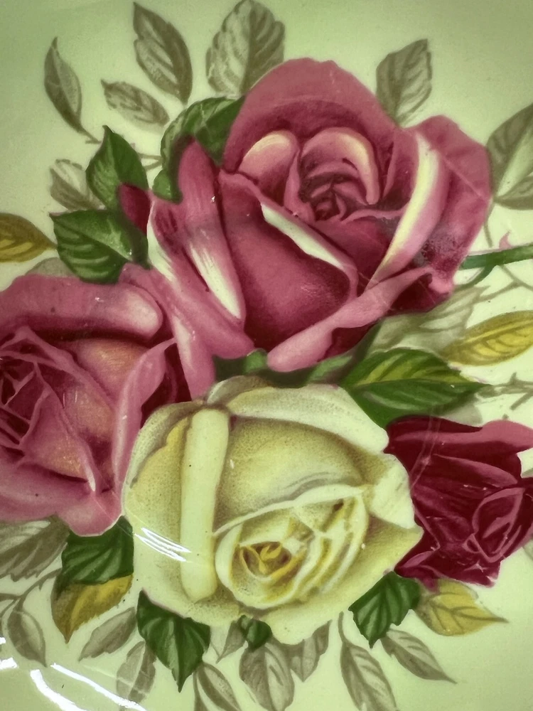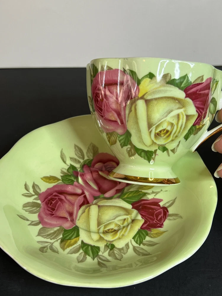 Vintage Queen Anne Yellow and Red Roses on Green Tea Cup and Saucer Set. A beautiful cup and saucer has never been used only on display . The saucer is about 5.75 inches wide and the cup is about 3 inches tall . I will pack it with great care and sent it to you ASAP Thanks for looking