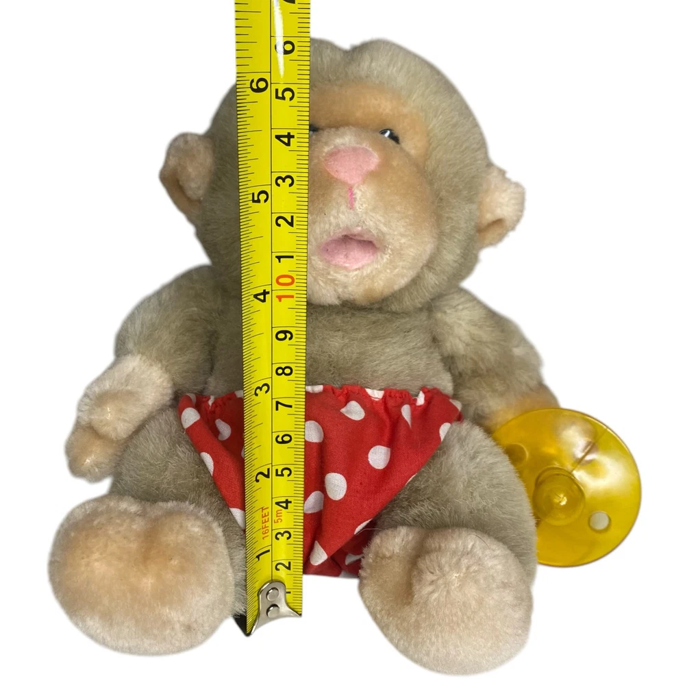Vintage RARE Russ Berrie & Co. 6.5" Baby Chee Chee Diaper Plush Stuffed Monkey Beautiful rare find! This Russ Berrie & Co. Stuffed Monkey is just precious Tanned with a red and white polka dot diaper He is also holding on to a rubber pacifier that fits in his mouth It's approximately 6.5" tall while sitting down Pre-loved and excellent vintage condition Color in pics may vary due to lighting and/or monitor settings SHOP POLICIES * All items ship within 1-3 business days (I always try to ship by next business day) * This item is used vintage/pre-loved * Any defects (if any) are noted and shown in the photos * All sales are final * Please review the description/pictures and ask questions before purchasing