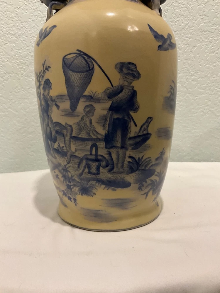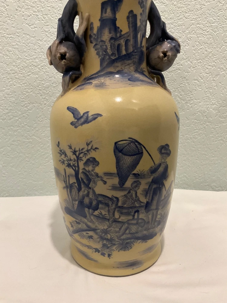This vintage vase is a rare find, featuring a unique ivory and blue color combination with crackle finish and handles in the shape of flower buds. Really unusual- I have never seen another like it. Standing at 14" tall and 7" wide, it adds a touch of elegance to any space. Perfect for collectors or those looking to add a unique piece to their home decor, this vase is sure to be a conversation starter with its distinctive design. There looks to be slightly raised lettering on the bottom but I couldn’t make it out. Truly a striking piece!