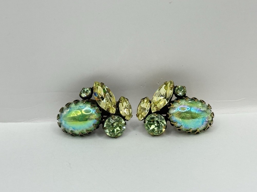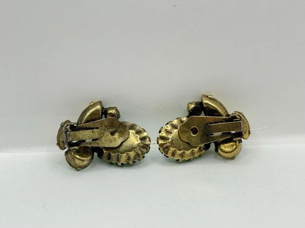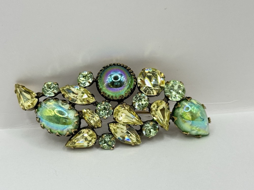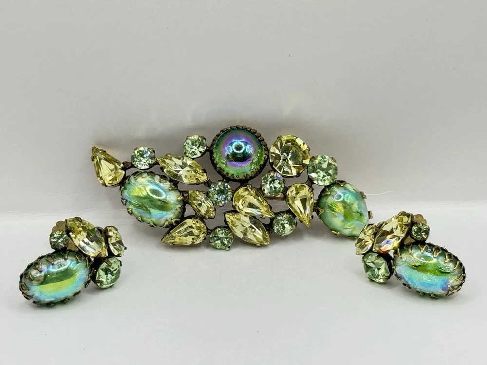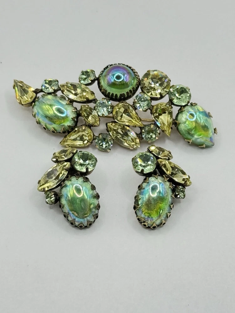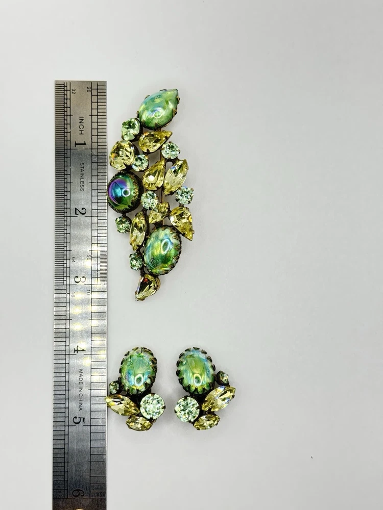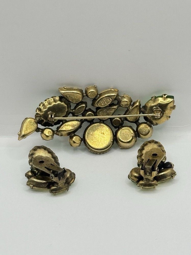 This Vintage Regency Large Cat Eye Art Green Color Glass Brooch Pin & Earrings Set is a beautiful and unique jewelry set perfect for various occasions like Mother's Day, graduation, anniversaries, birthdays, and more. The set includes a brooch pin and earrings, both featuring a figural shape with a green glass main stone and crystal secondary stones. The vintage design from the Retro era (1935-1950) exudes beauty and artistry, making it a standout accessory for women who appreciate timeless elegance. The set is signed by the brand Regency and was made in the United States, adding a touch of authenticity and quality to this original piece.