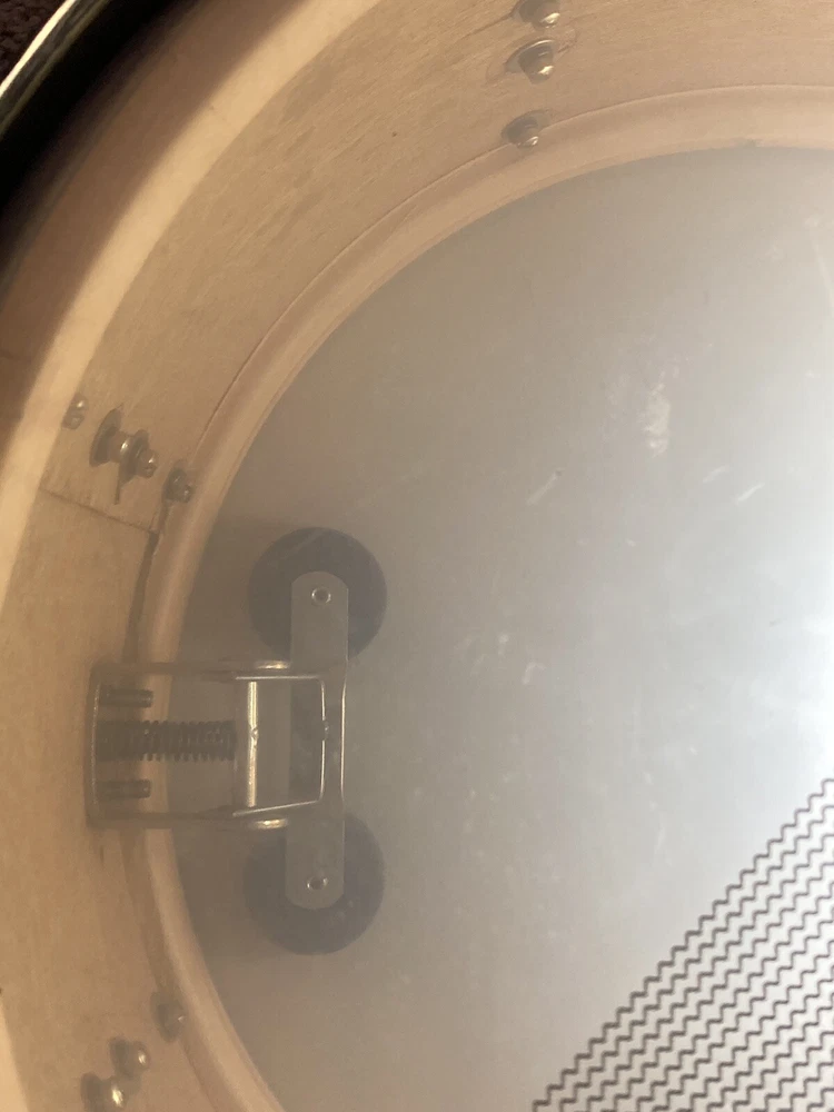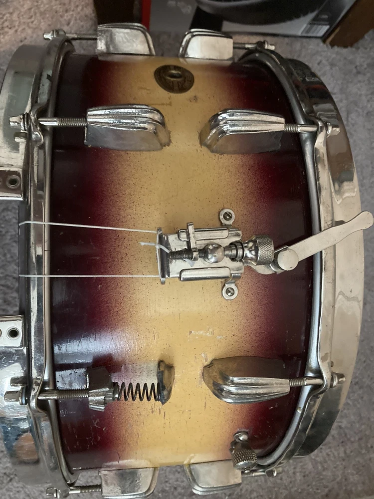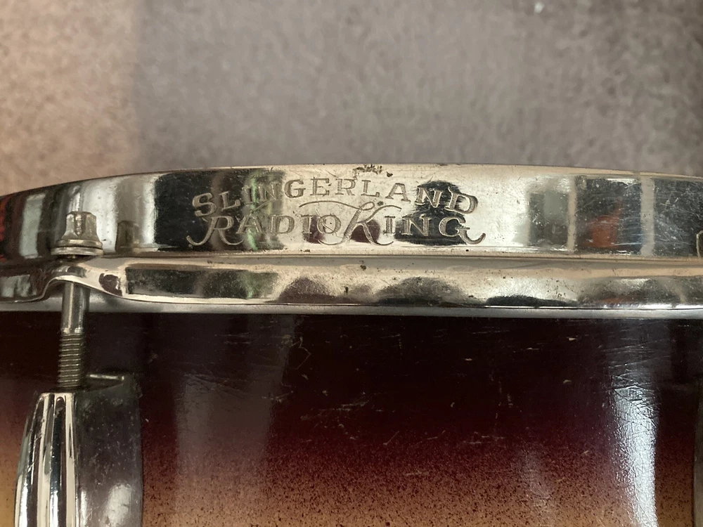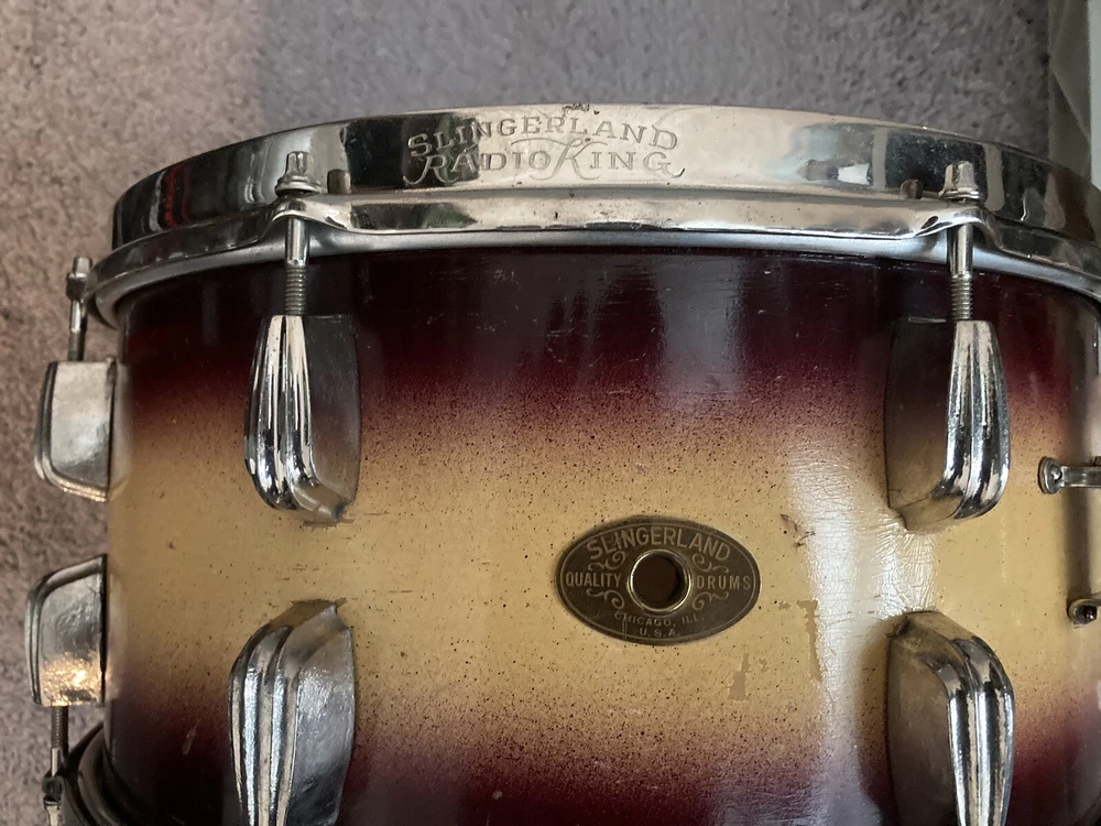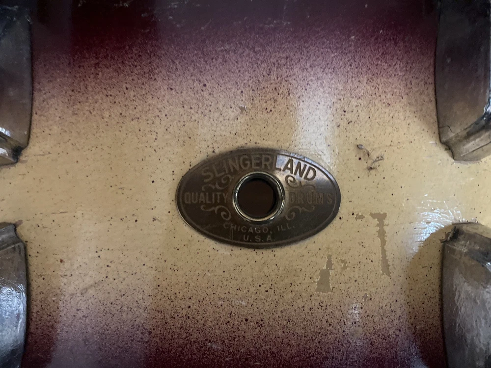 Slingerland Snare with oval Chicago badge. Scallop lugs. One lug covering is missing. It came off during Orchestra transport. It dates around the 1940s. Has good tone and plays well. I have used it on multiple occasions. Rims are engraved.