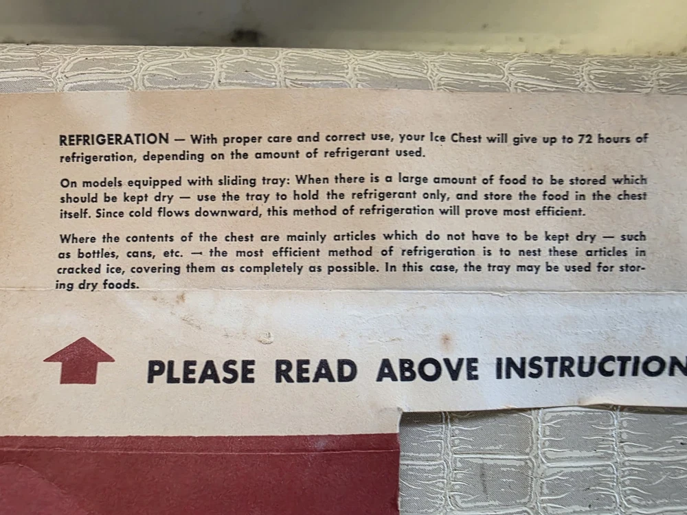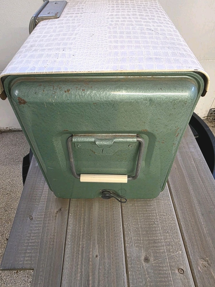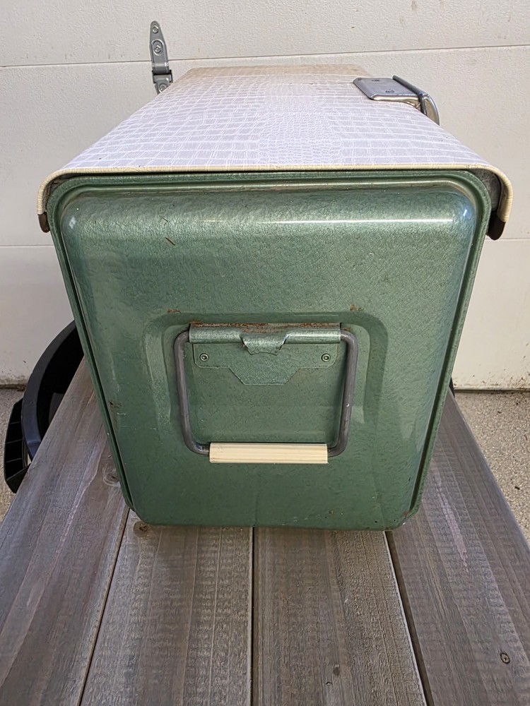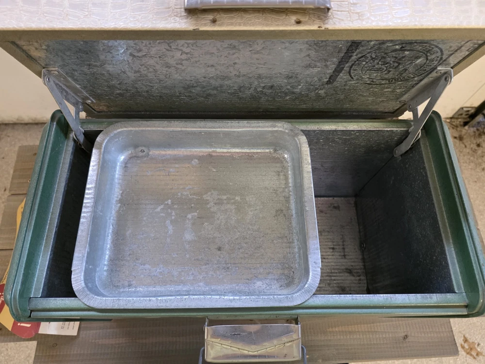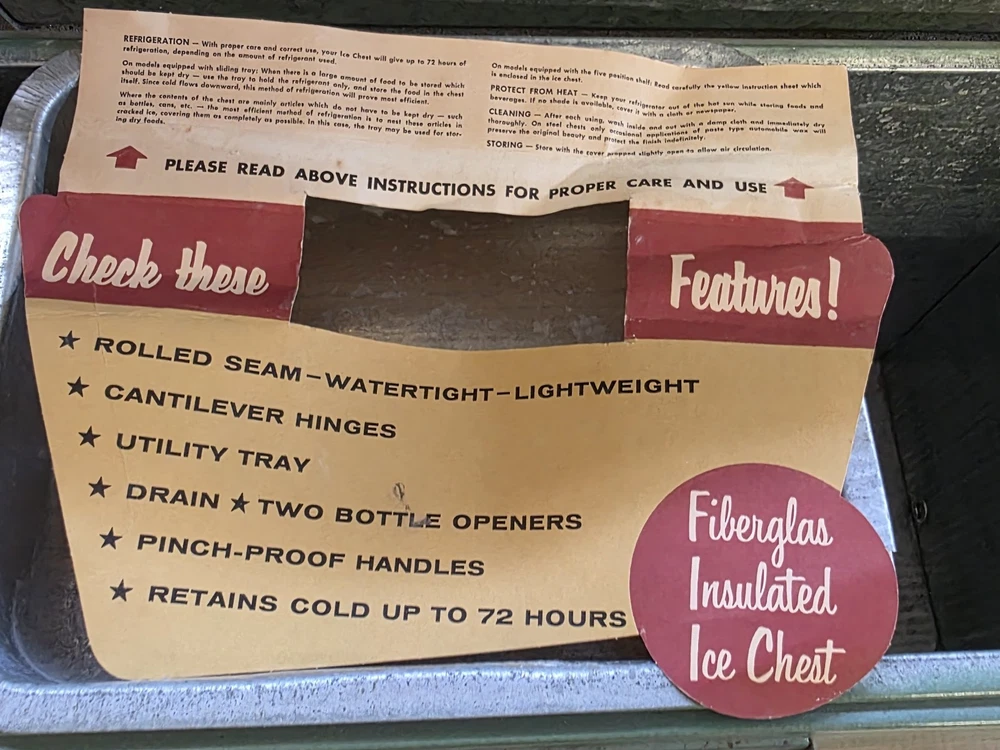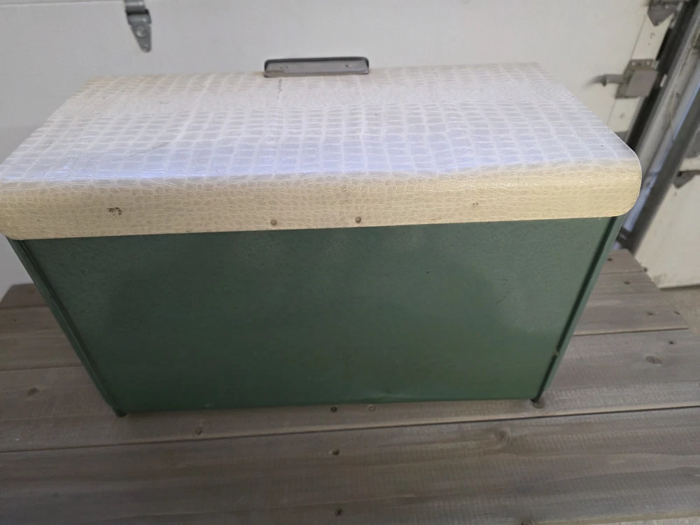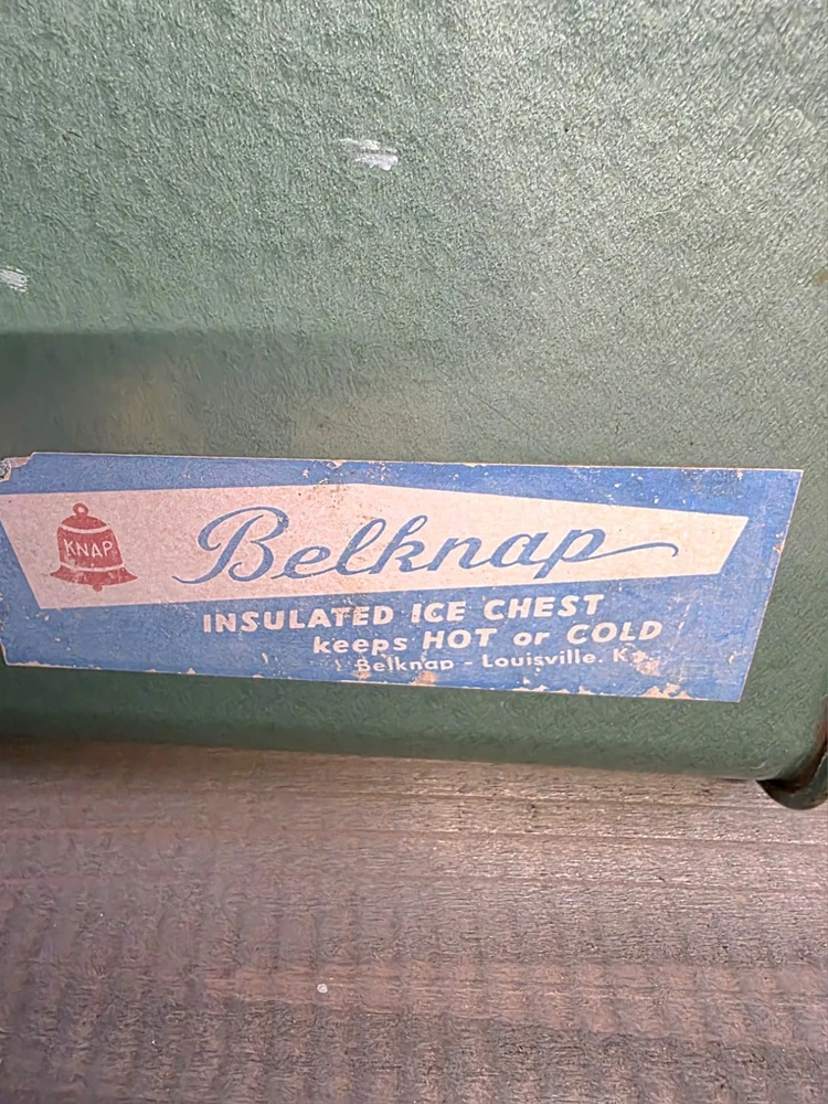 Incredible NOS BELKNAP ICE CHEST PICNIC COOLER, with original advertising card. This ice chest is from my family home, my Dad purchased in the 1950's for our road trips every summer to the White Mountains, in New Hampshire. Our 1955 Desoto was green and our Dad loved the color of this ice chest. We never did use it, so it ended up in storage. It's new , never used but does have some dings and dents, scratches and abrasions from being stored for 70 years. If my memory is correct, we purchased this at our local Sears Roebuck Auto. Please see all the photos for closeups of any issues . Belknap Ice Chests were manufactured in Louisville, Kentucky. Heavy Ice Chest and weighs approximately 19 pounds boxed up. Attractive Ivory design lid, green sides and bottom. All aluminum interior with food tray and plug for draining. Pickup is in Union NJ 07083 or Woodbridge NJ 07095 or shipped via USPS Ground Advantage.