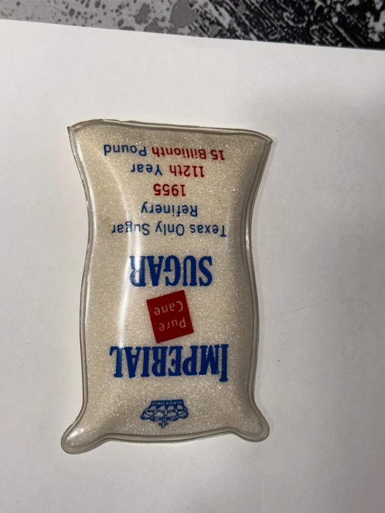 Vintage and Very Rare : Imperial Sugar Company Advertising / Customer giveaway " Sack of Sugar Paperweight dated 1955 " Size: 3x5x1 Condition : Used , some wear and aging but colors and advertising still bright and bold and legible. NOTE : the Plastic & Sugar are still pliable inside and the Bag has very slight tackiness due to age of the plastic (69 years) , but still in excellent condition. Date : 1955 / Adverting its " 112th year and marking the15th Billionth pound of Sugar produced. The rear has other stats , facts and information . Comment on rarity : I've collected several Imperial Sugar pieces of advertising for quite sometime and I've never seen anything like, I've had this in my collection for 20+ years. All sales are final No returns Questions please email Shipping USPS Thank you for your interest