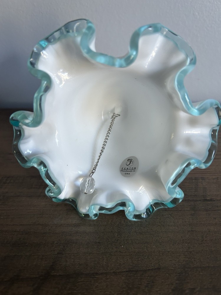 This product is a rare Fenton white milk rose bell, originating from the Americas in the late 20th century. It is signed by the brand, made of glass, and hand painted with a glossy finish. This vintage bell features a beautiful rose design, adding a unique touch to any collection or decor. Made in the United States, this original piece showcases the craftsmanship and artistry of Fenton.