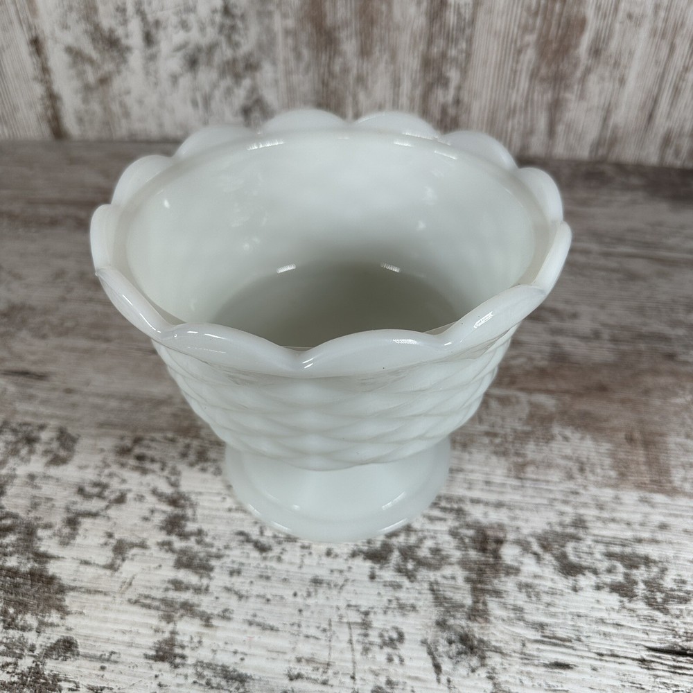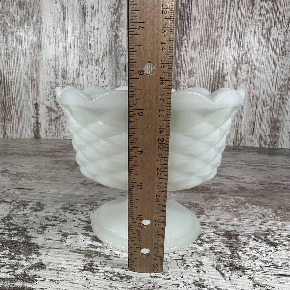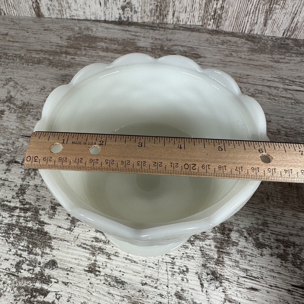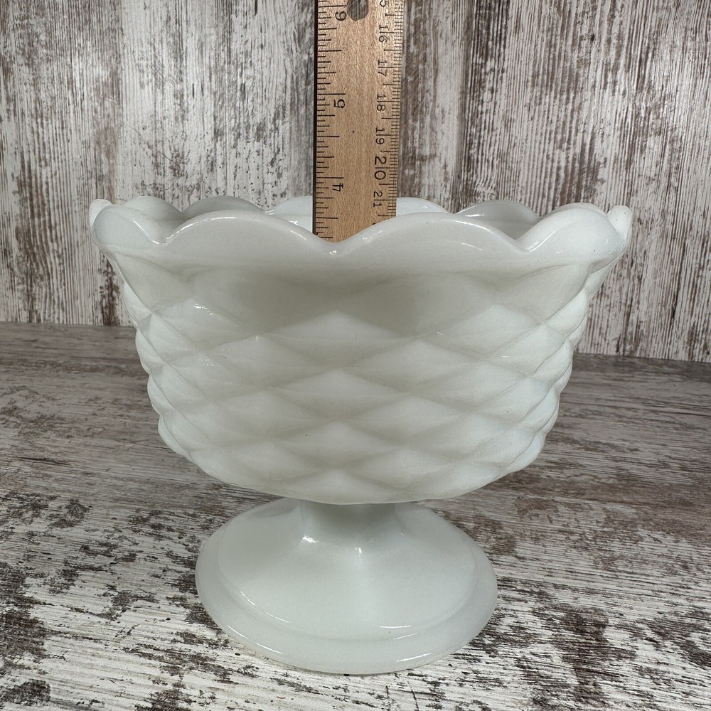 Vintage:YesFinish:GlossyProduction Style:Opaque GlassUPC:Does not applygtin13:Does not applyShape:RoundType of Glass:Milk GlassColor:WhiteOriginal/Licensed Reproduction:OriginalType:Candy DishProduction Technique:Fused GlassBrand:UnmarkedModel:Footed BowlMaterial:Glass