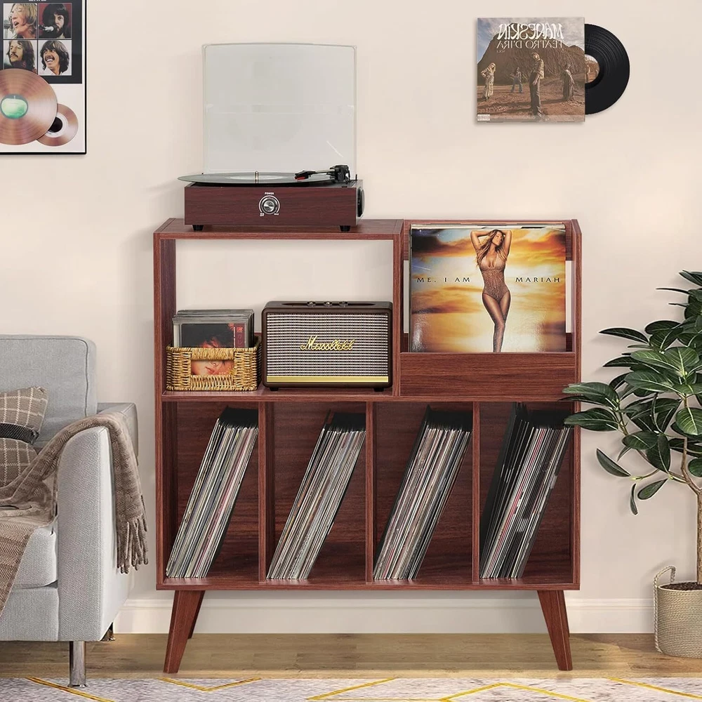 Product Description: 【Typical Retro turntable stand】 This large record player stand is assembled with a full wooden structure, and each panel has a unique wood texture. This huge vinyl record holder is like a ship full of historical stories sailing on the sea, carrying every vinyl record you love, allowing you to freely navigate the boundless sea with the melodious melody. 【Easy storage for 300 records】 This ultra-large capacity record player holder can easily store more than 300 vinyl records, with 4 broad partitions to store different styles of vinyl records. We have also designed a unique open display area for the vinyl records in this record player table for you to easily select the vinyl record you want. 【Connecting to audio equipment is more convenient】 The hollow back panel design makes it easier to connect the audio and record player, and the storage space below the record stand can hold most external audio sizes. This super-large vinyl record storage is an excellent choice for most black vinyl record lovers! 【Tough rubber wood support legs】 This all-wooden record player table body is assembled with environmentally-friendly wood boards certified by the rubber wood legs. Its reasonable structural design gives it a more stable carrying capacity. Dimensions: 31.5'' L x 15.75'' W x 32.52'' H, width of a single partition below: 7.48'' H. Specification: Color: Walnut Recommended Uses For Product: Vinyl Records Product Dimensions: 15.75"D x 31.5"W x 32.52"H Special Feature: Storage Material: Wood