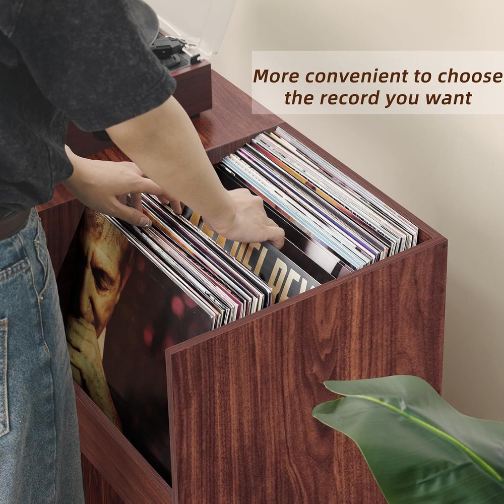 This record player stand is a dream for vinyl lovers! The sturdy wooden build holds up to 300 lbs, and the spacious storage fits over 300 records neatly. The retro design adds a classic touch to any room, while the wide partitions keep everything organized. Perfect for both style and function—highly recommend for any music enthusiast!